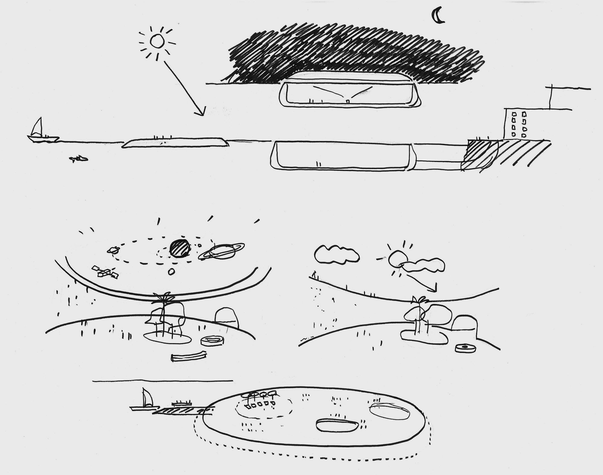 The main idea is to generate an environment whereby visitors feel that they themselves are entering the water to discover the beauty of the marine life on display; a living shell that opens to the sky during the day to reveal the sea worlds and which closes as darkness falls to take on a “second life” as a planetarium, protecting the arena and the biome domes within, like a shell protects the pearl.