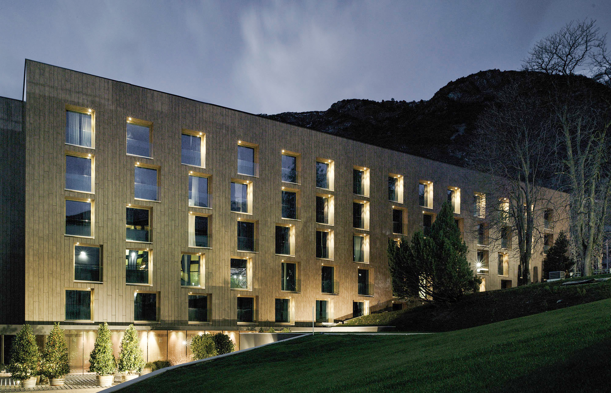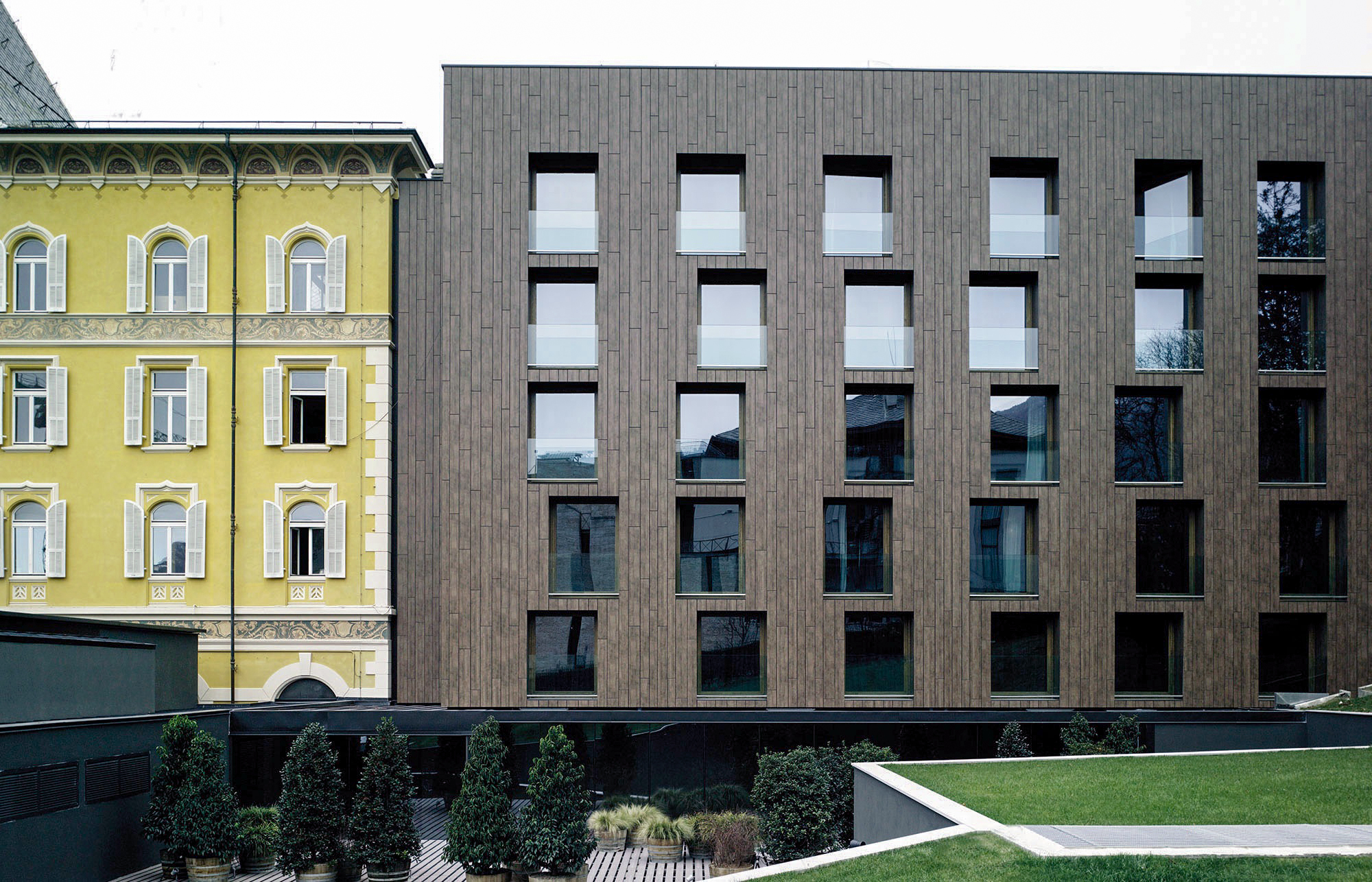The Parc Hotel Billia dialogues between modernity and the artisan traditions of stone, metal and wood. The façade of the Parc Hotel Billia comprises wooden slats and large window openings.