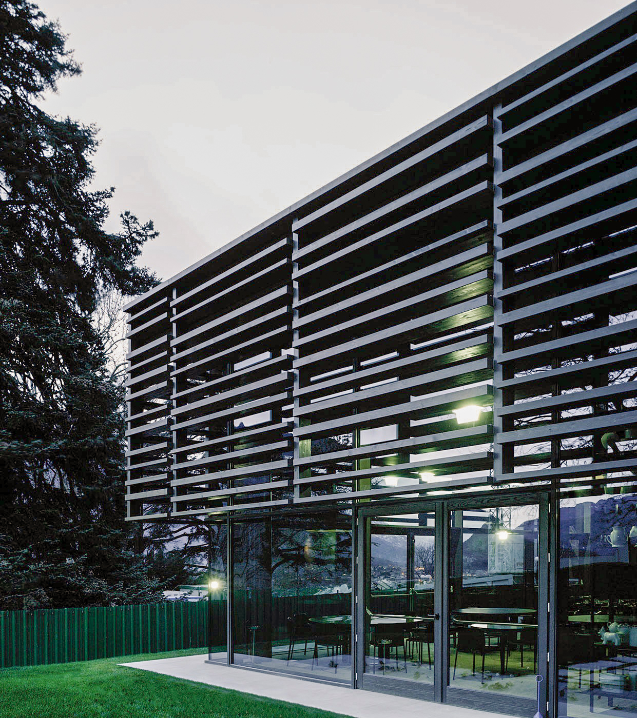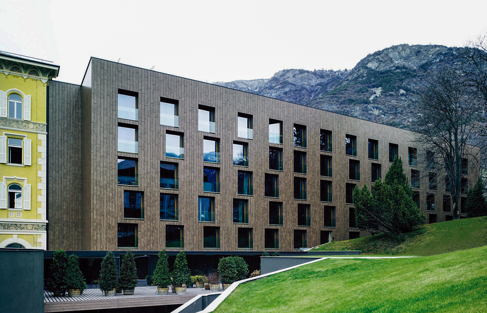 The architecture is designed with large windows protected and shaded by a weave of rough planks inspired by the houses of the valley's Walser community.