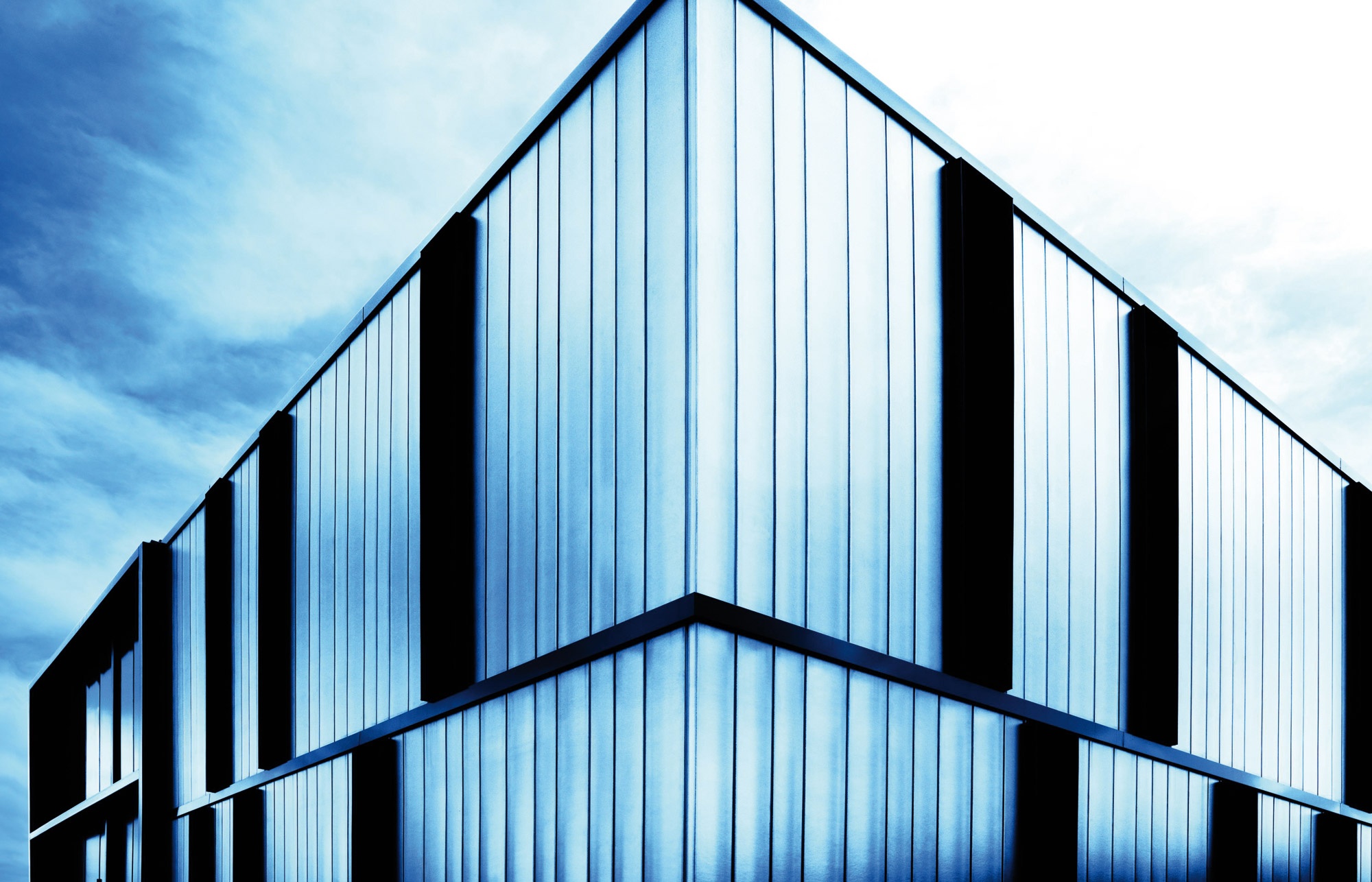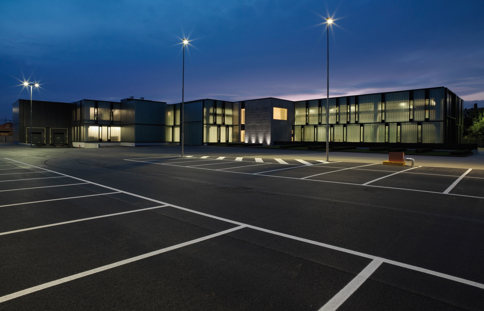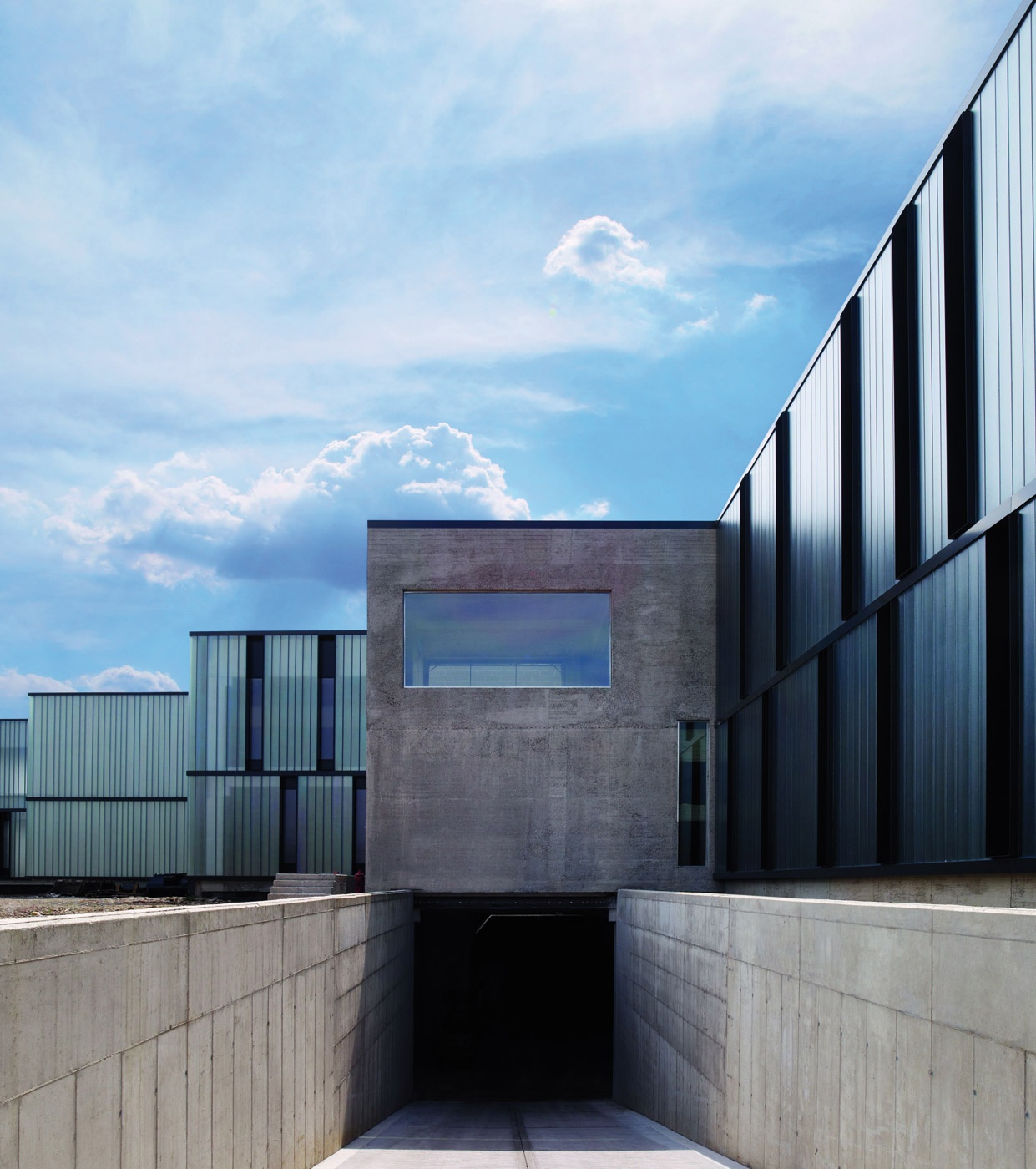 On the north side of the building, two cubic structures made of sandblasted, reinforced slab concrete dominate the headquarters, a reference to the Italian architect Carlo Scarpa.