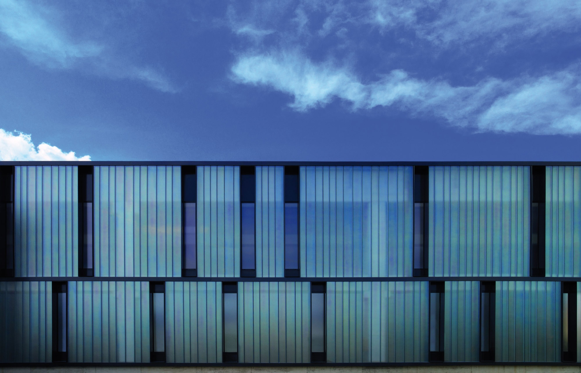 The signature feature of the 10,000 square-meter building is its external cladding, which encompasses both the pre-existing parts of the structure and a completely new complex. The façade is punctuated at irregular intervals by narrow, black steel, window frame insets with horizontal glass lamellas. These provide an additional source of natural light and contribute to the pleasant circulation of air inside the building.