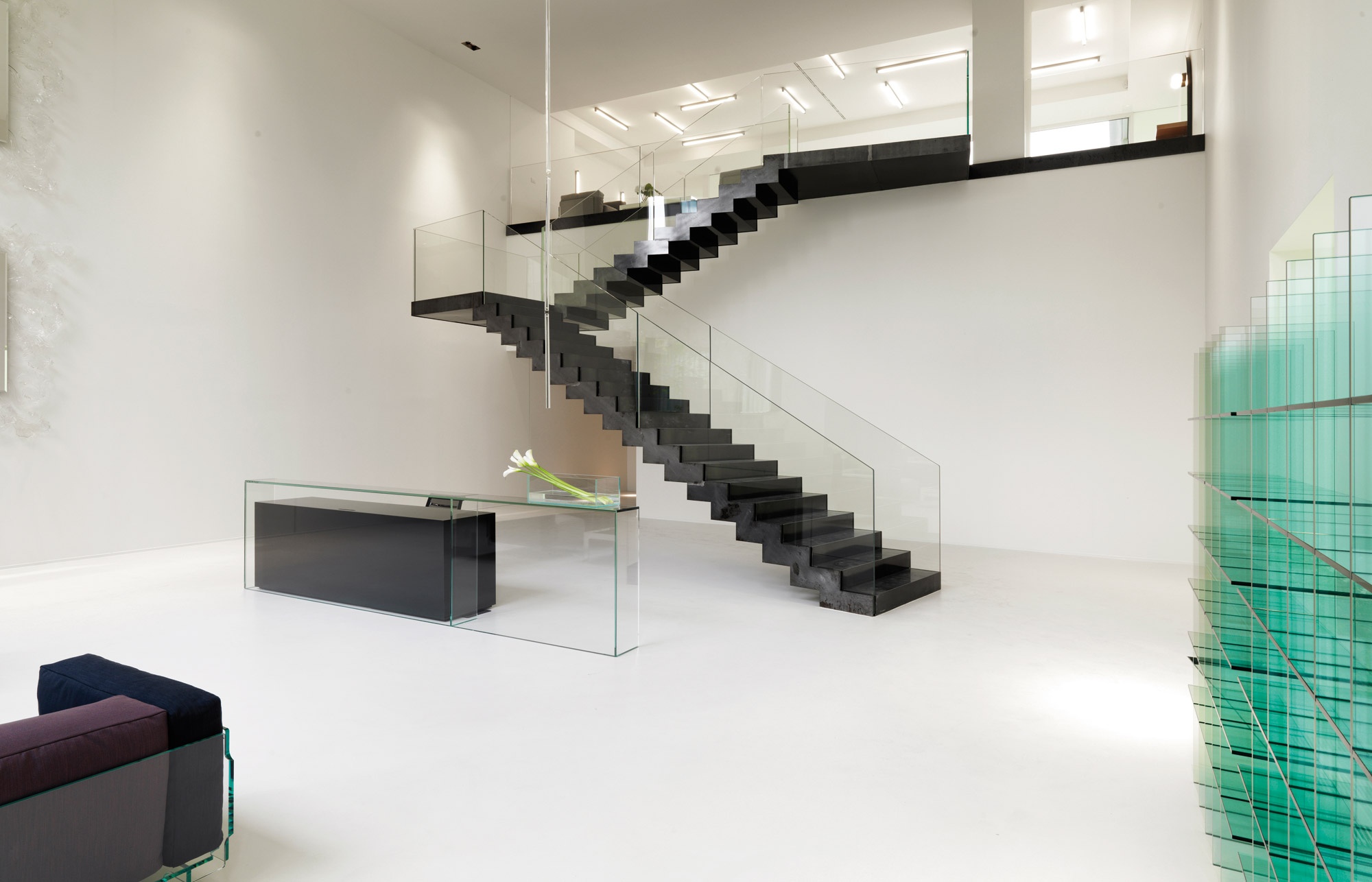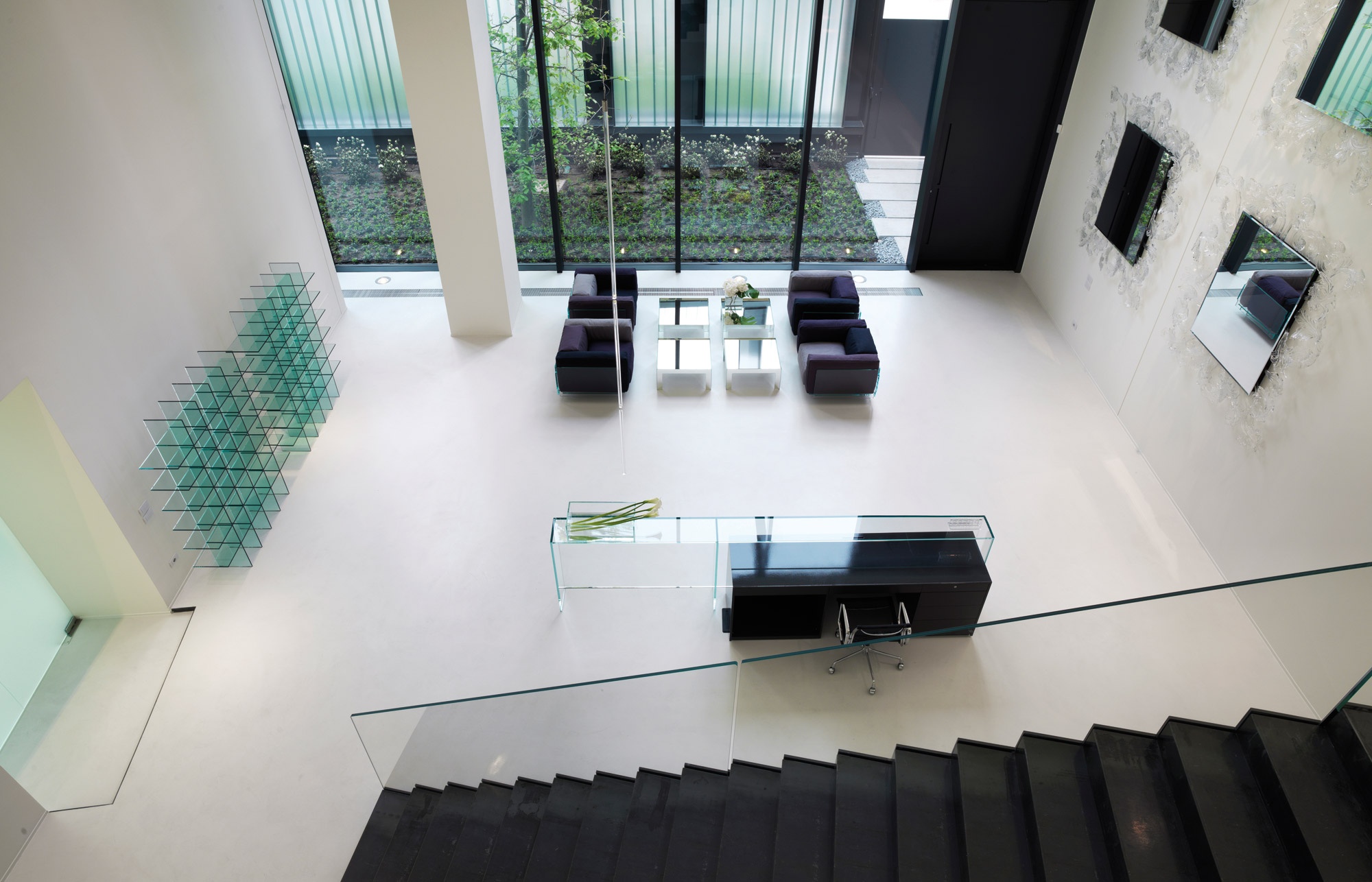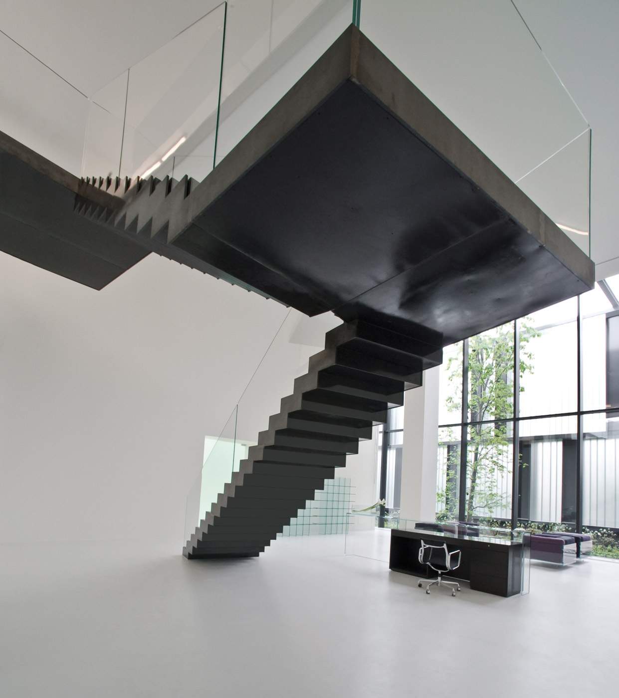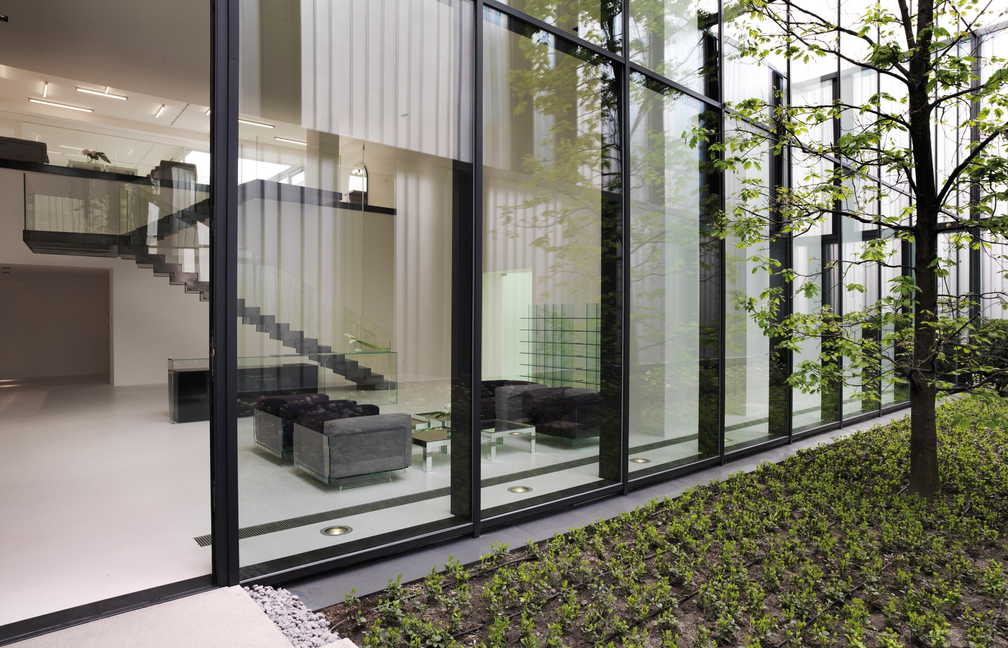 Employees and visitors enter the building through the main entrance, an opening in the façade, behind which lies an open-air atrium and garden with a small pond and green area planted with trees. A wooden walkway leads to the light-flooded reception area with glass windows extending the full height of the building. Here, an imposing stairway made of black steel and glass captures the attention and leads to the first floor, where the offices, meeting rooms, cafeteria and showroom are situated.