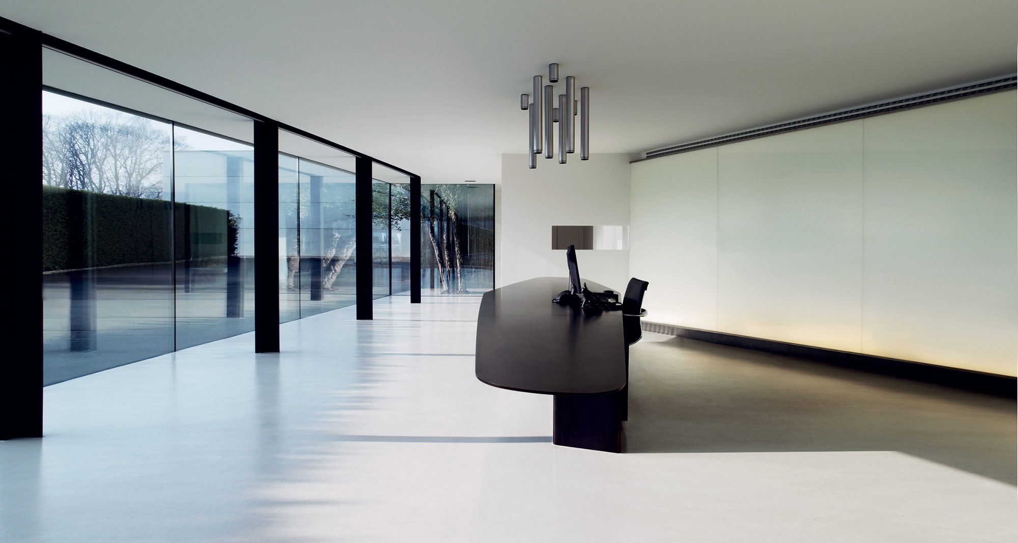 The roof and narrow base are flush with the large glass windows on the sides, and these two components extend past the windows on the right and thus form a sheltered entrance area that is also marked by a large red arrow. Visitors are welcomed at a massive and heavy table made of six welded metal plates which is placed in front of a glass wall within this indirectly lit entry area.