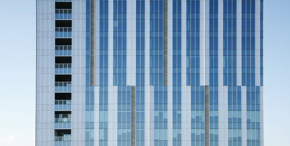 At night we imagined the towers to create an abstract play of light, referring to arrangements of binary codes. Aluminum panels were folded outwards to create light slots which can be seen only from certain angles. This means as you walk past, the 4 towers subtly change in appearance.