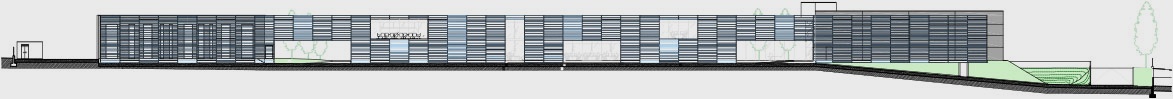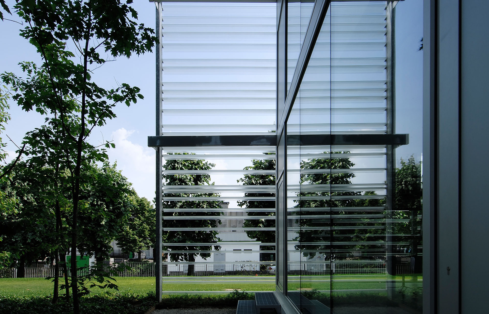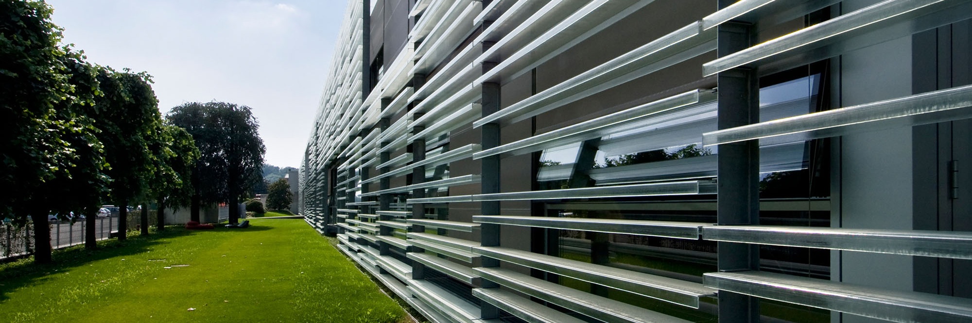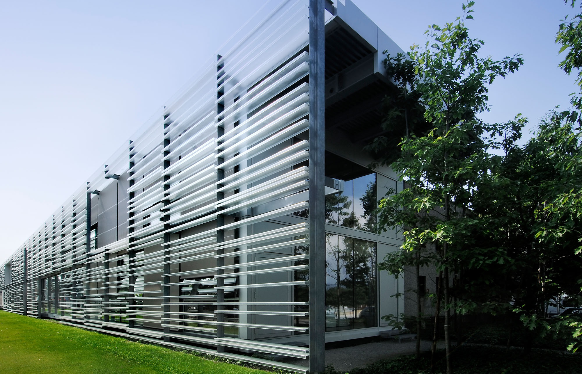 The decisive component of the design includes plates of U-glass mounted onto the galvanized steel structure of the building. These plates extend horizontally across the entire frontage and are installed in front of a traditional glass façade. Placed at irregular intervals along the façade, the individual panes are 3.3 meters long and recall musical notes or scores.
