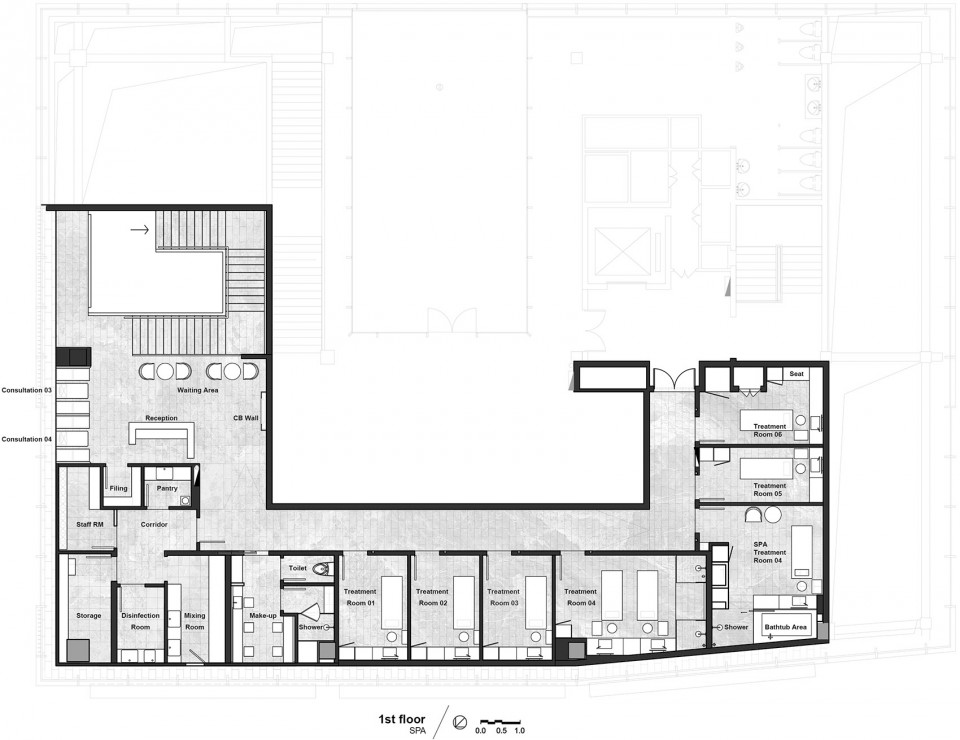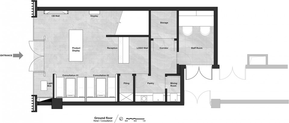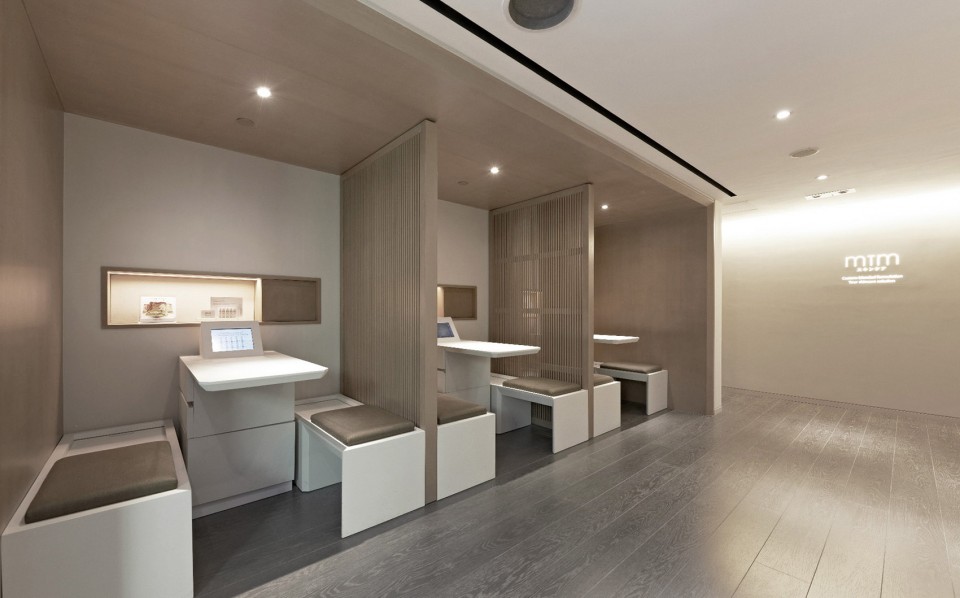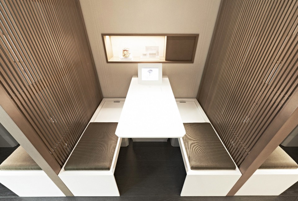顾客在特别设计的隔间中可以会见咨询师并进行皮肤测试。这个过程处于开放空间中,但顾客的隐私也可以通过一系列的日式屏风(Koshi,格子)得到保护。