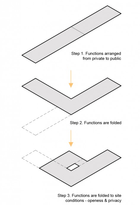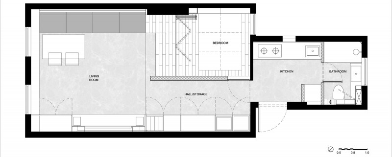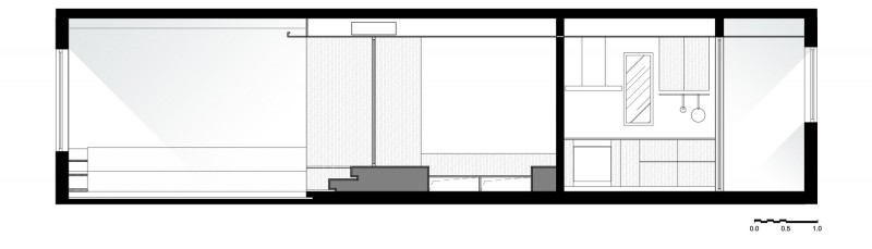 In order to maximize storage space and to facilitate moving the WC and washing machine, the floor level changes through the design. The living room steps down from the hallway creating more height, whilst the bedroom is accessed via 3 steps which gives a more intimate environment, whilst creating much needed storage space under the bed. The steps also double as informal seating when we have guests.
