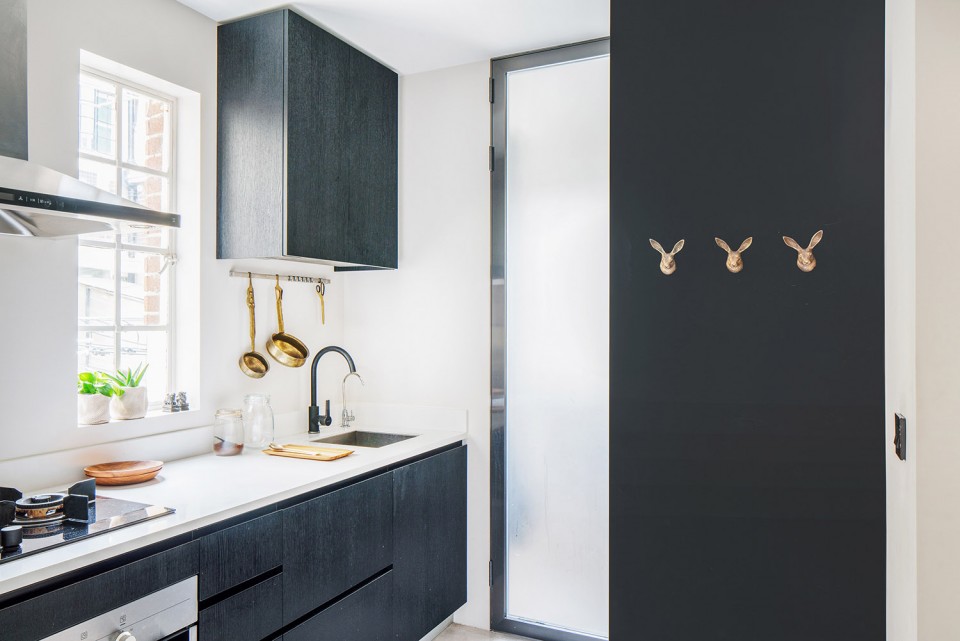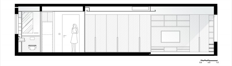 On the bedroom side of the spine wall it is finished with upholstered fabric to give a close acoustic environment. The opposite side of the wall is clad with full height mirror, useful for dressing and helps to expand the sense of space in the hallway, doubling the perceived area.