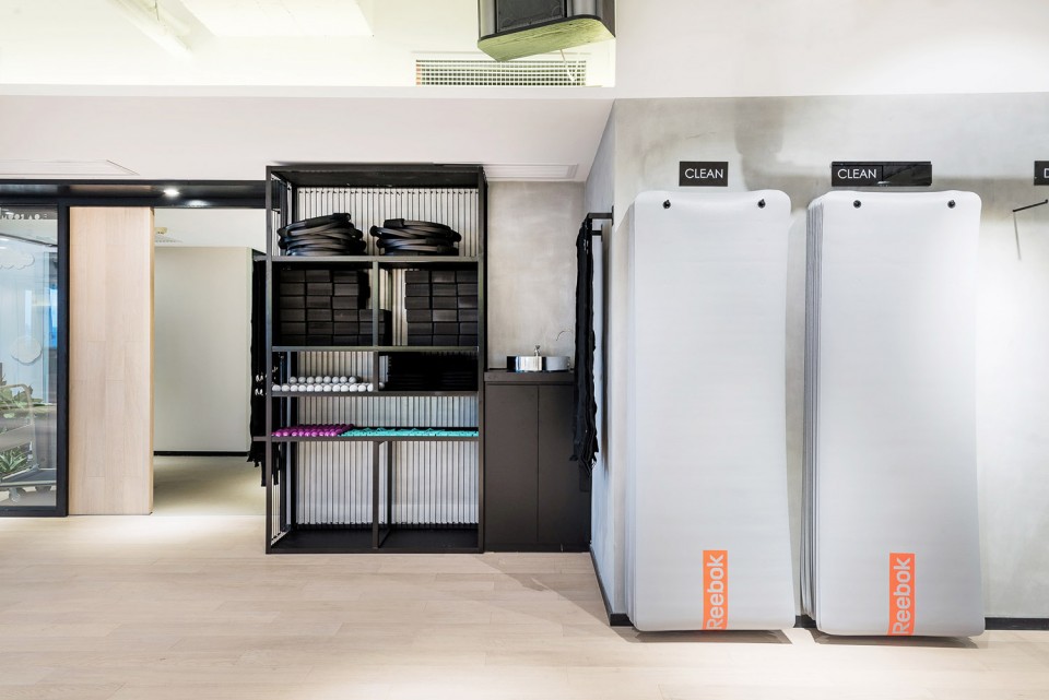 Instead of hiding all the storage, the gym equipment is neatly organized into black metal frames. The sides of which are lined with taught black exercise bands, always under tension, kudos to the stretching and hardwork performed by the studio’s clientele.