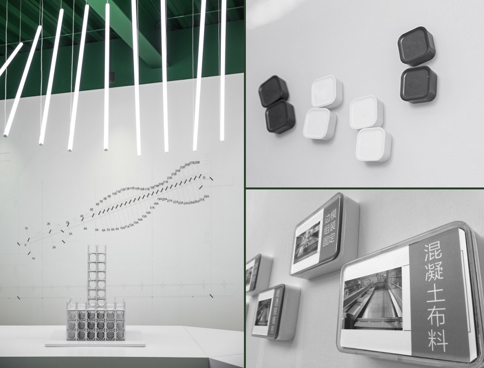 最终,我们设计的平面布局非常简单明确,并没有刻意制造迂回的参观路径,区域内只看到一片”墙”,一组”桌”,看似”空旷”,却内有乾坤。我们始终认为这个展厅应该是有别传统的,具有未来感的,技术感的。因此一改展板、展台为主要陈列载体的惯例,将道具、界面、展品、甚至照明设备都变成了诠释者,所有元素都是由各自的基础单元模块装配组合而成,以直观的”搭积木”方式,将”装配”的概念一以贯之。