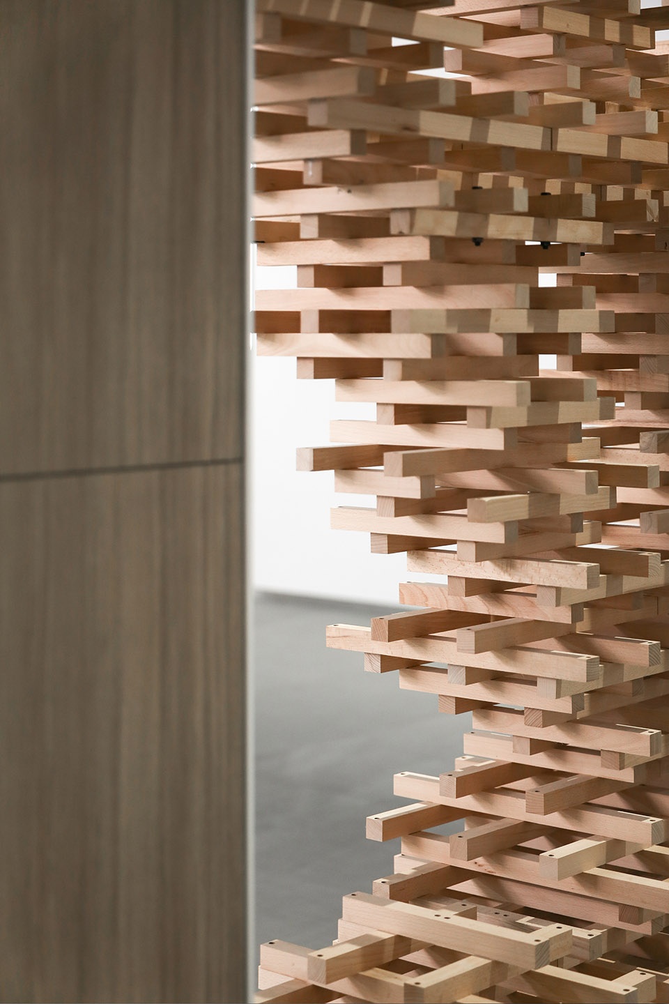参数化木单元太湖石——这次与谢亿民设计合作实现的又一亮点是一座以参数化设计生成的太湖石雕塑,通过”机器人木构”技术,模拟并重现了太湖石的形态。