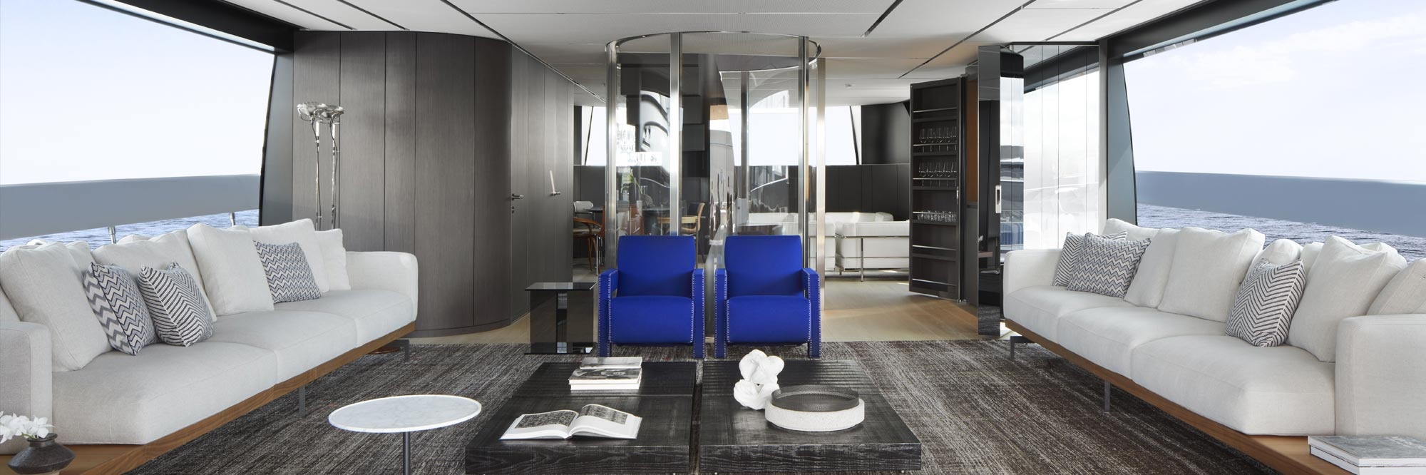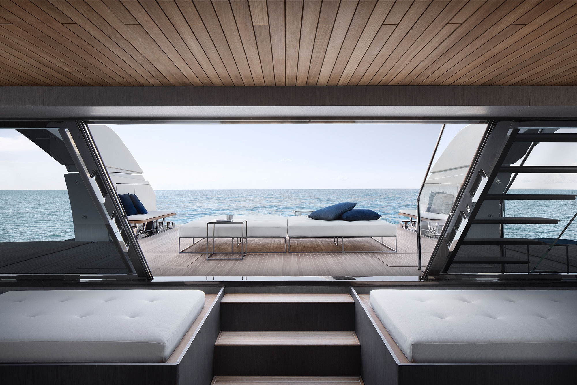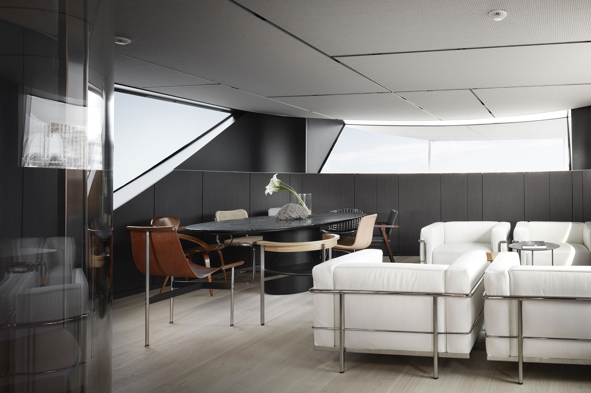 In tune with the concept developed for the other models, the main deck has been organized as an open plan space that reinterprets the concept of a yacht interior, extending as one single and continuous context from stern to bow, with a living area adjacent to a bar zone and followed by one of the dining areas, in a seamless indoor-outdoor arrangement that is further accentuated by the large windows looking over the sea.