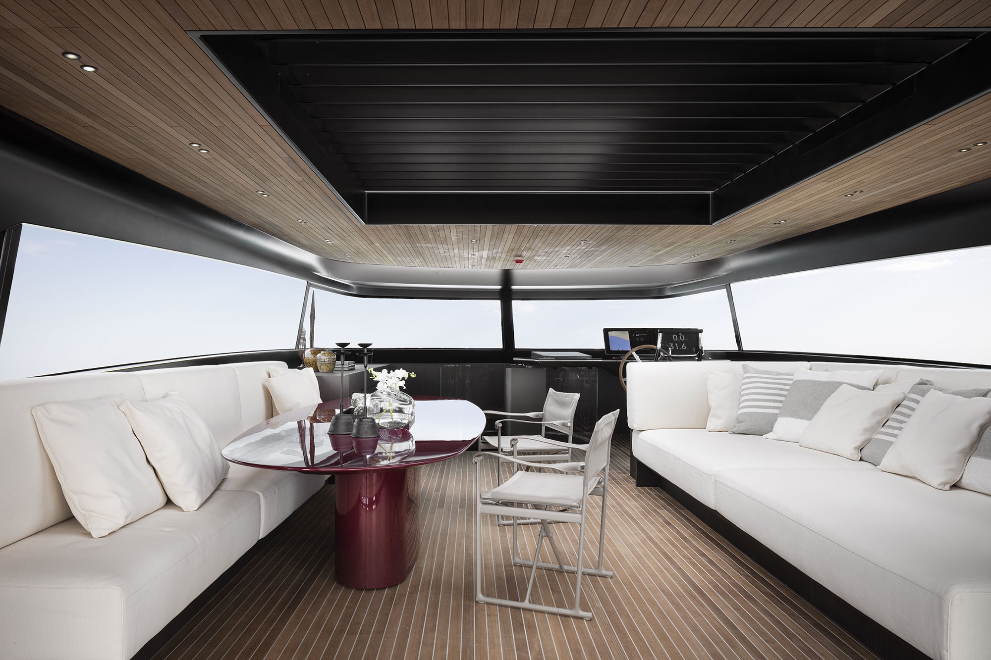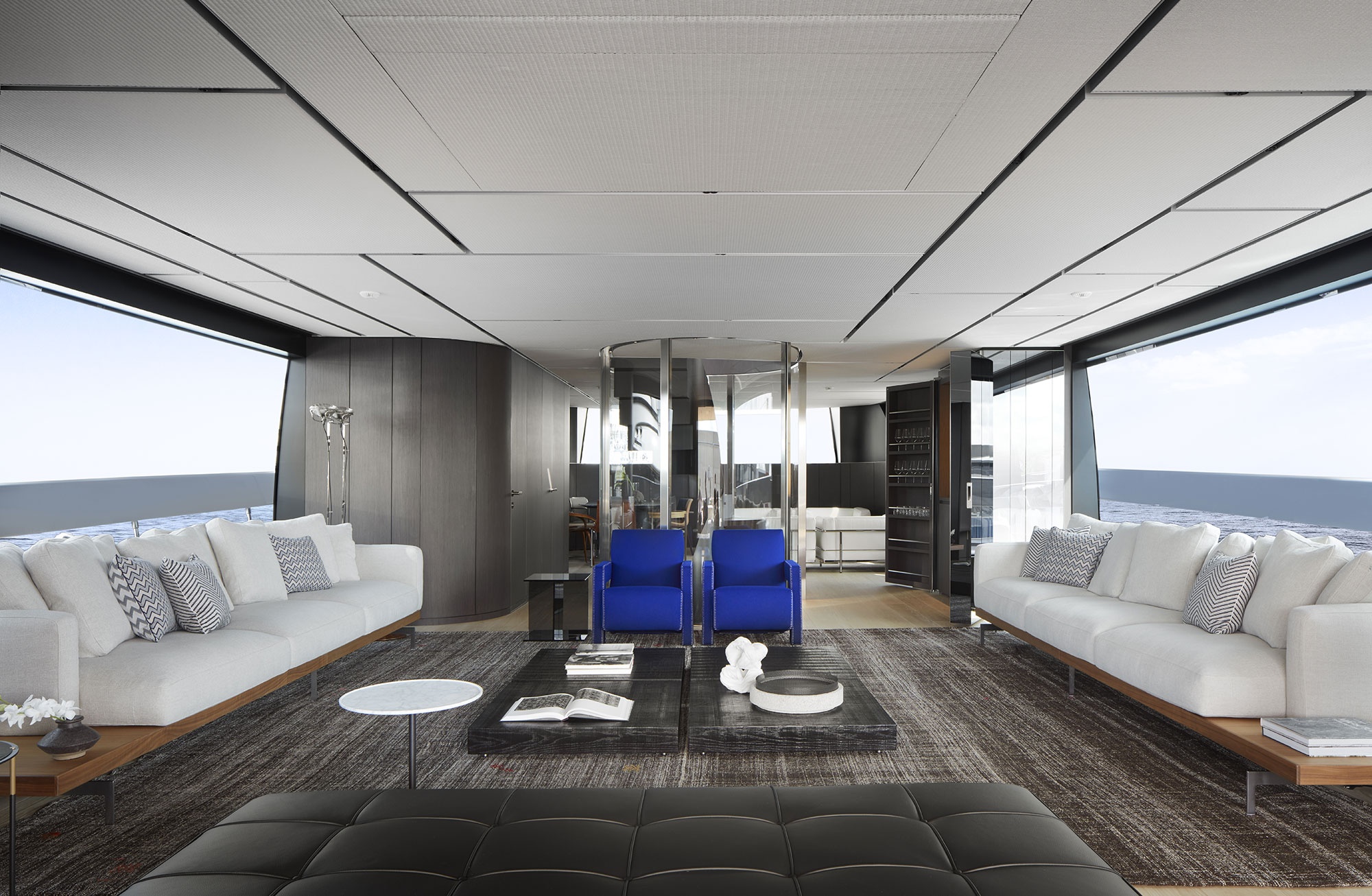 与为其他车型开发的概念一致,主甲板被组织为一个开放式空间,重新诠释了游艇内部的概念,从船尾延伸到船头,作为一个单一的连续环境,生活区毗邻酒吧区,然后是一个用餐区,在一个无缝的室内外布局,这是进一步强调了大窗户眺望大海。