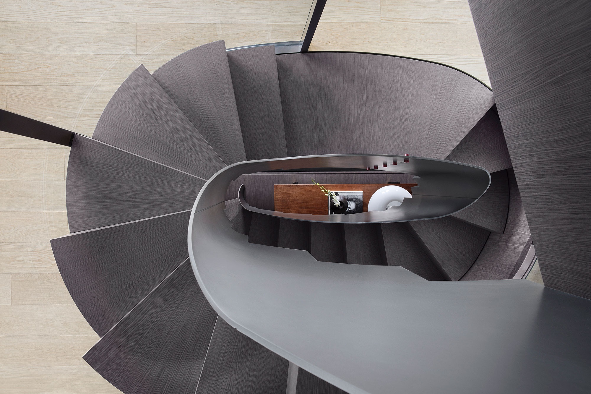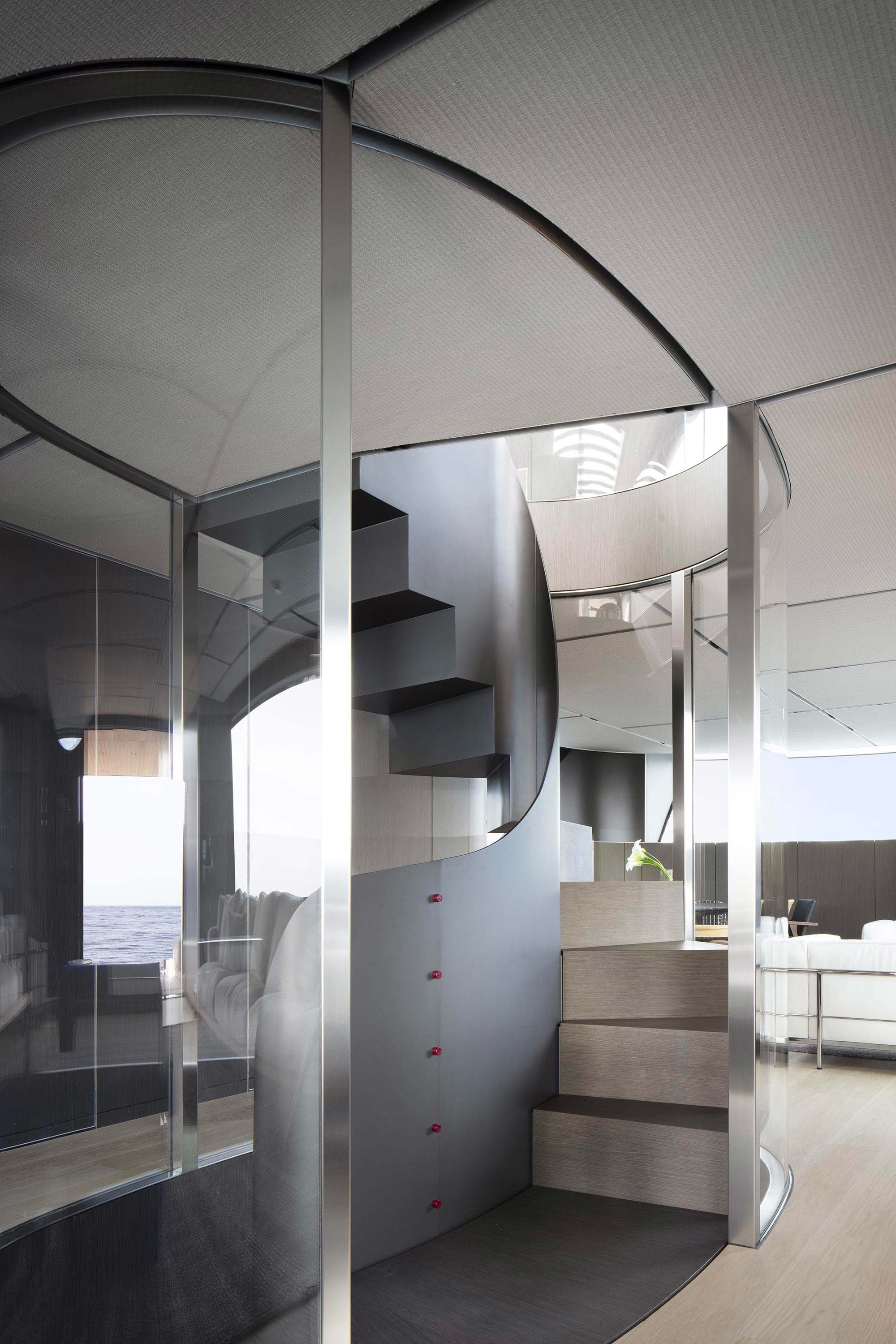 楼梯再次成为Lissoni设计的基本特征。螺旋形的内部楼梯延伸三层连接甲板,在主甲板上被封闭在一个透明的椭圆形空间中,就像一个珍贵的宝箱,这进一步增强了它的存在,使它看起来悬浮在半空中。外部楼梯的设计干净、基本,符合赛艇的原则。