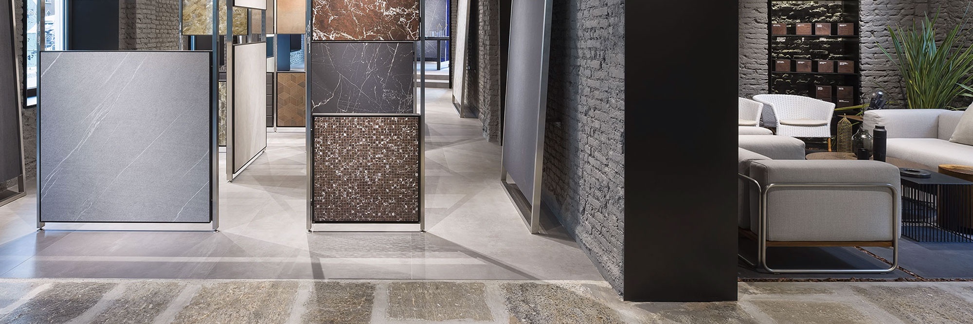 The showroom is divided into different areas. The “Gallery” area, where the principal features are the display elements designed as panels to show the various products as if they were framed paintings, and thanks to a ceiling incorporating smart technology and guides, these can be moved to generate different pathways according to need.