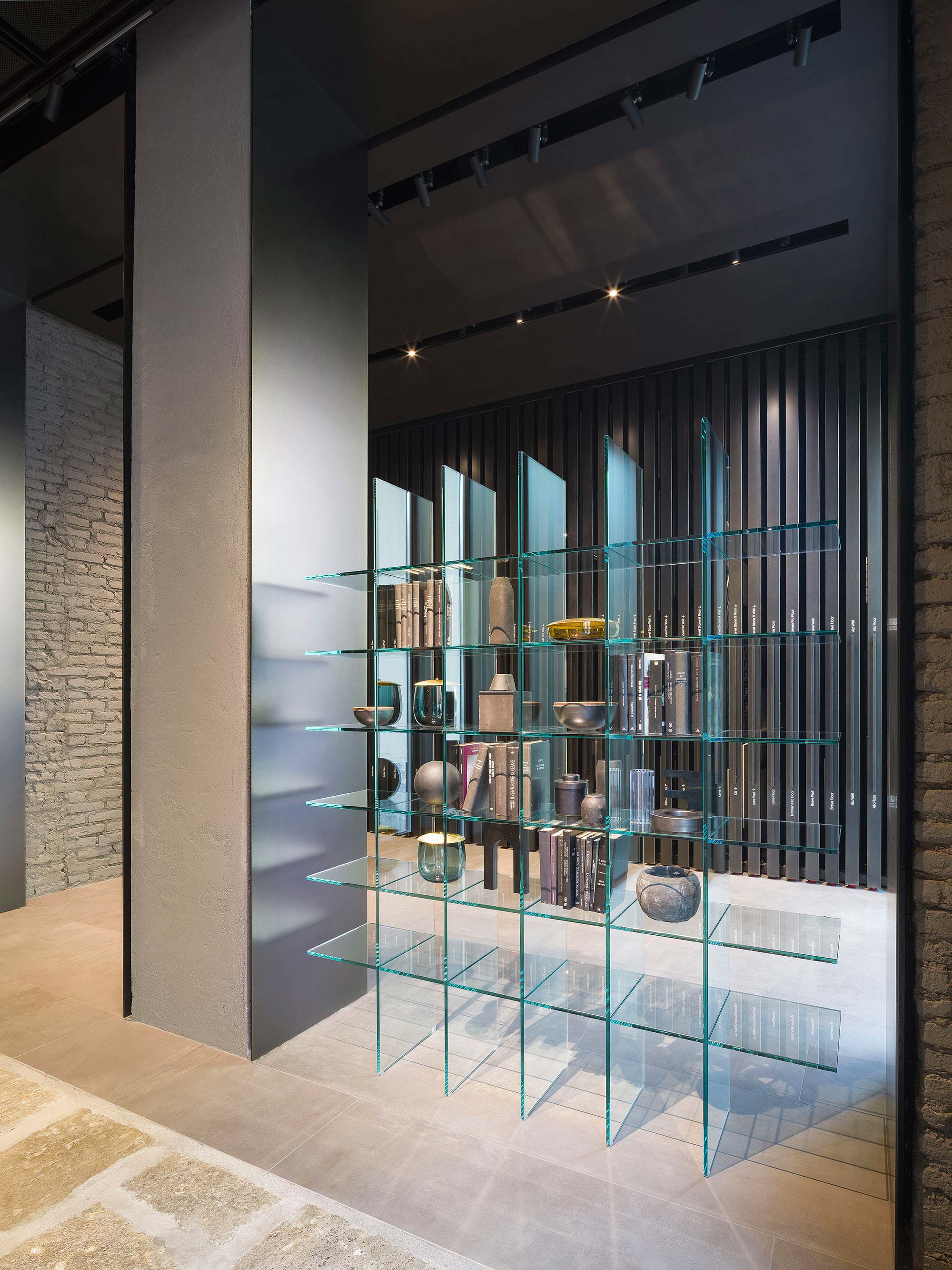 The Materials Storeroom was instead inspired by museum archives, and large sliding panels in metal mesh enable the products to be displayed in different ways depending on the collections that the company wants to present.