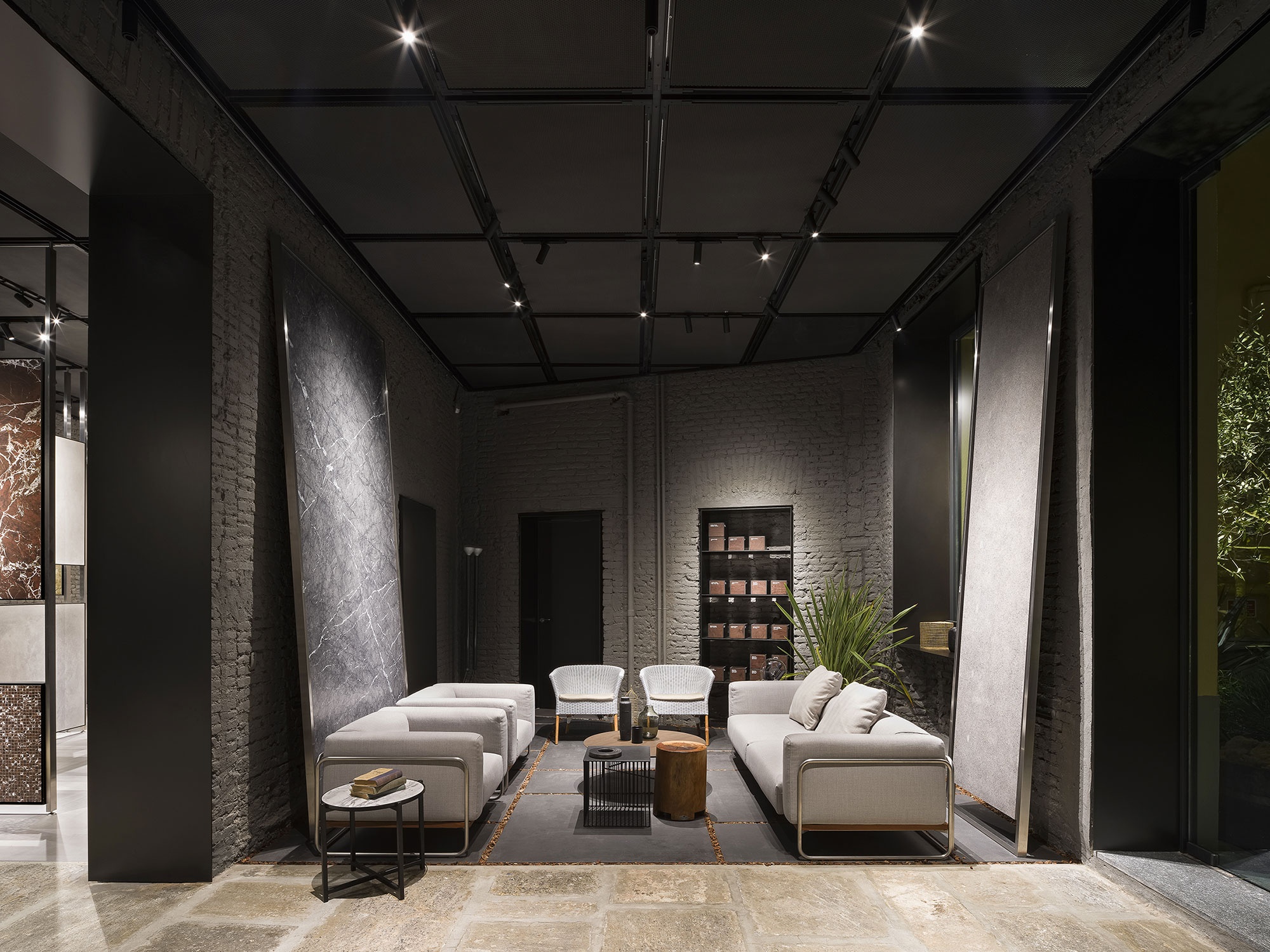 Towards the inside, there is a lounge area for receiving clients, a co-working area with a large table for meetings and the kitchen, all redesigned and clad with Atlas Concorde products. In each room, materials from the catalogue pave the floors to display their distinctive characteristics, while the flooring of the internal courtyard presents the products from the outdoor collection. Painted metal plate frames the doorways to uniform and enhance the passageway openings in the bared-down walls. Lastly, there is also an area reserved for temporary exhibitions, further animating the space with new projects and installations.