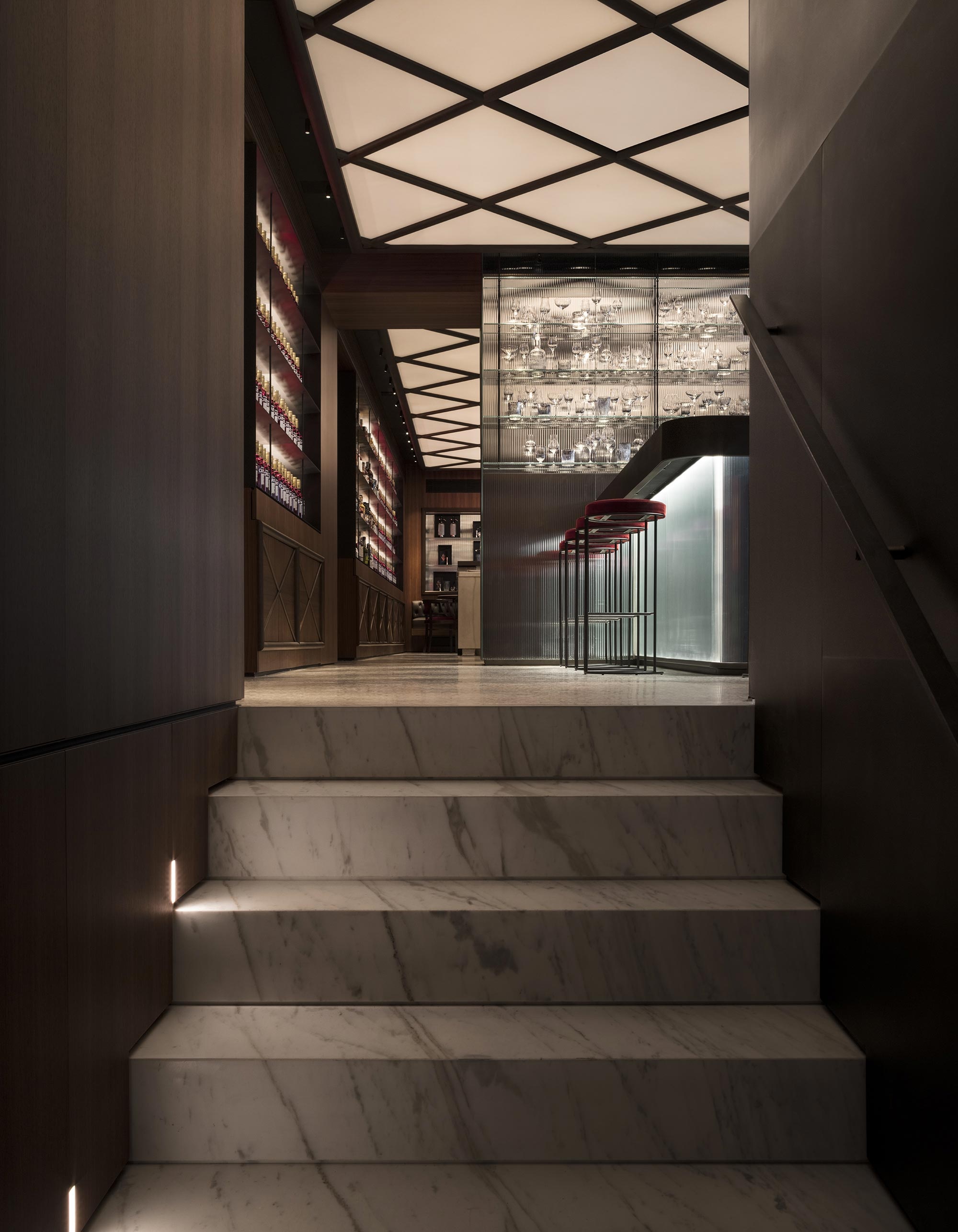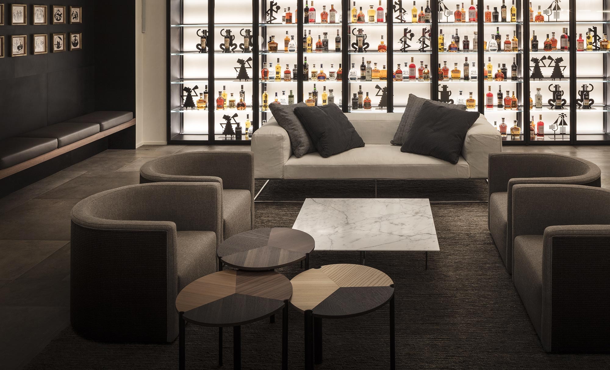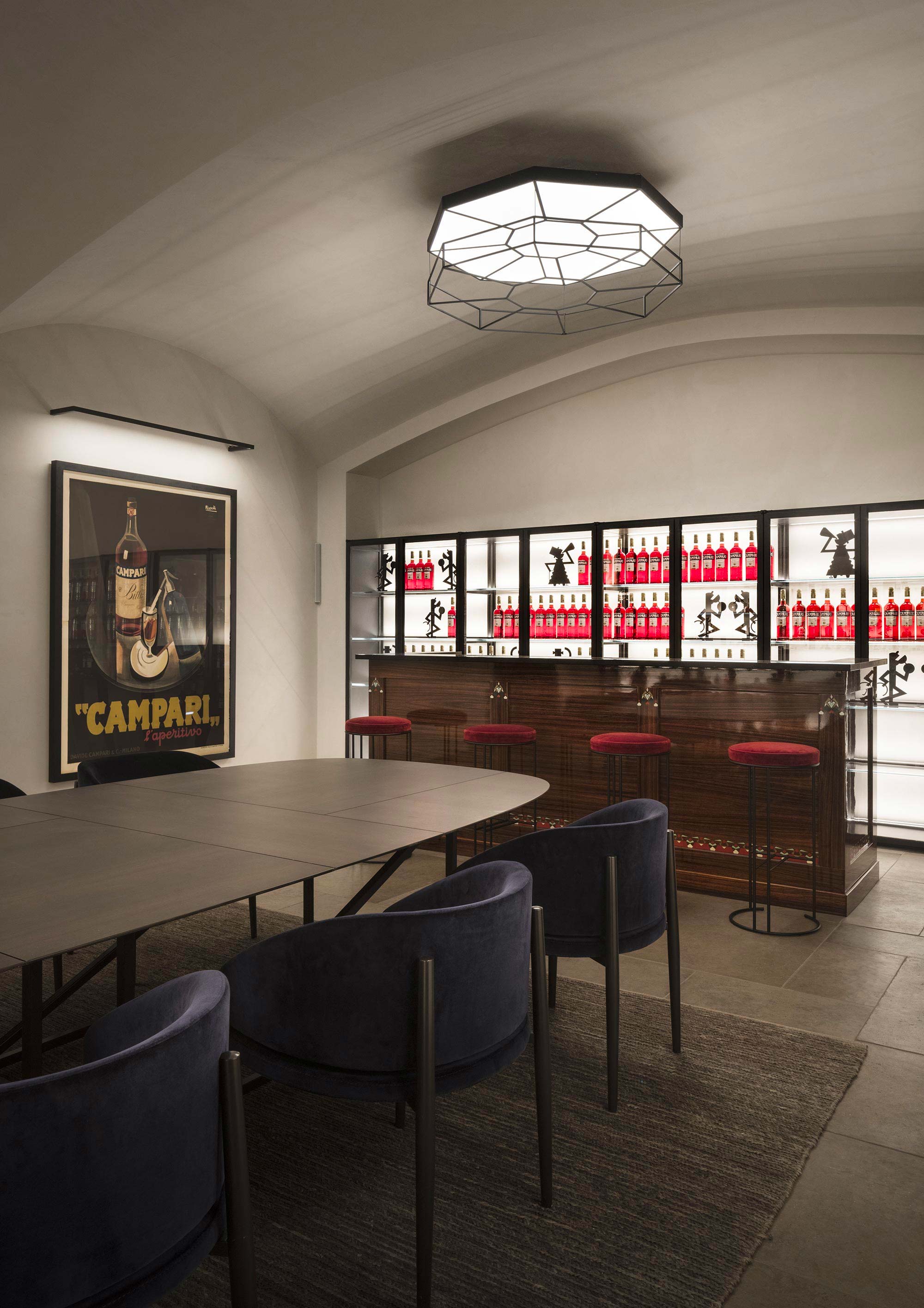 The Sala Gaspare Campari on the basement floor is totally new: a cozy and elegant space where the ceiling lights recall the design of the medallions on the floor of the Galleria and which features a wood counter that was originally on the first floor.