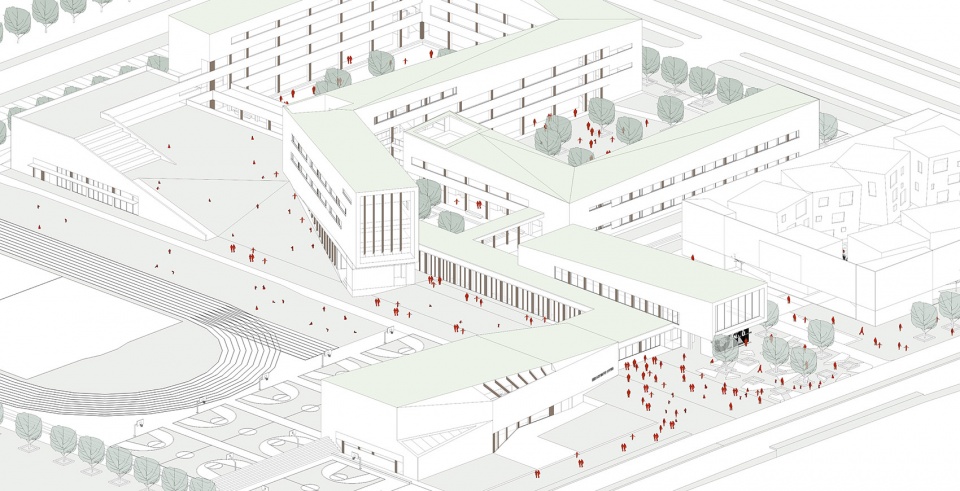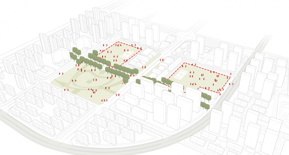中学设计里,将中学前场打开,使其成为城市广场的一部分,作为社会生活与学校活动的“缓冲空间”,校园前场“场景”功能的变换,消解了内与外的边界线,使得校园与社区的互动成为可能。