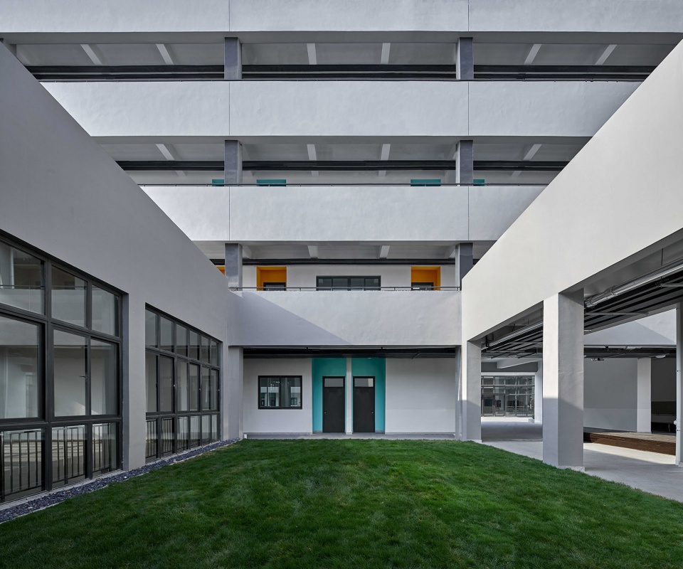 小学设计上,原有的混凝土围廊带来的庭院空间,形成天然的人气聚集点,为倡导交流与学习的行为提供了一种便利,弱化了学校生活与社区生活的边界。我们将图书馆抬到连廊之上,使其展示面与核心绿地产生对话,更是对超越校园边界的一种尝试。
