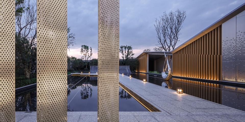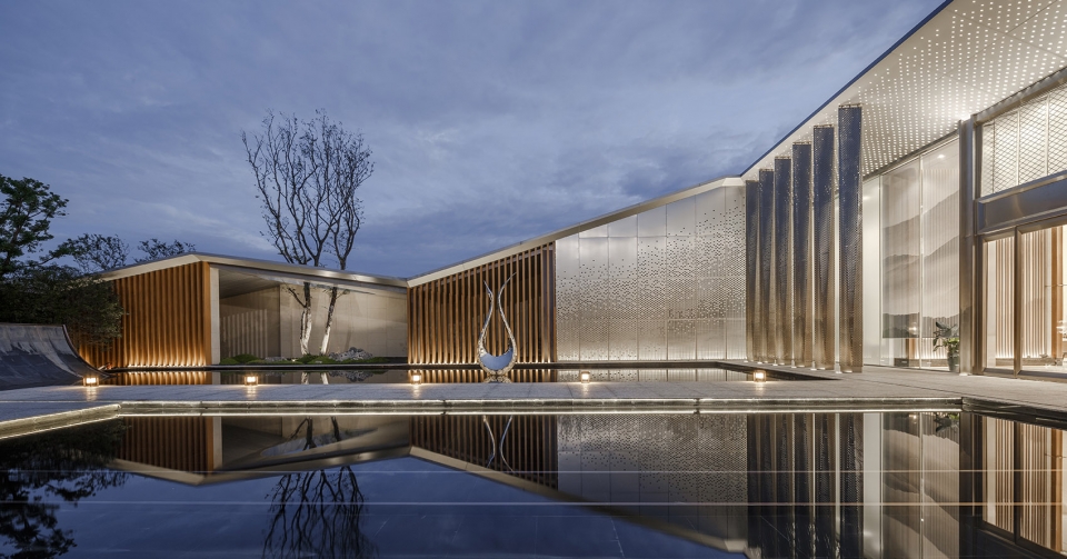 ▼纯净的水面倒影出起起伏伏的屋面形式,穿孔板星星点点的肌理,给人以无限的遐想