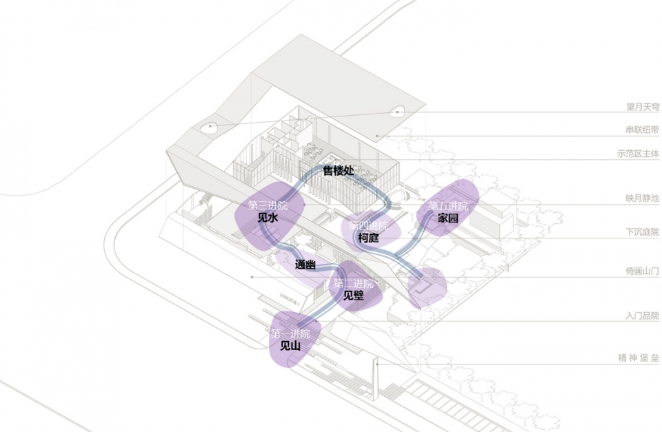示范区借鉴中式园林,采用景观递进和步移景异的设计手法,在有限的用地内创造丰富的空间感受。示范区由山门进入,山水影壁映入眼帘,进而转入小庭院,通过水中步道到达售楼处。售楼处与样板间中间通过下沉式庭院相连,起承转合,一气呵成,仿佛置身山水之间。五进院落,四重转折,起承转合,营造多重场景体验。