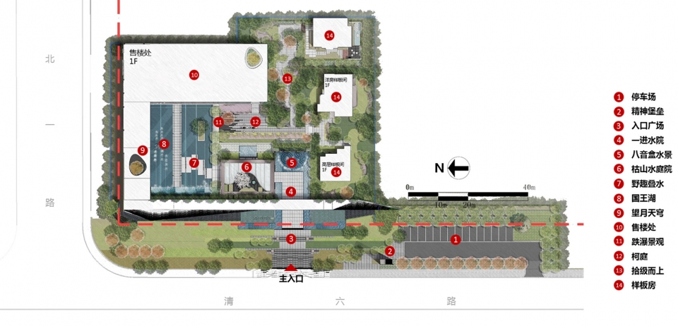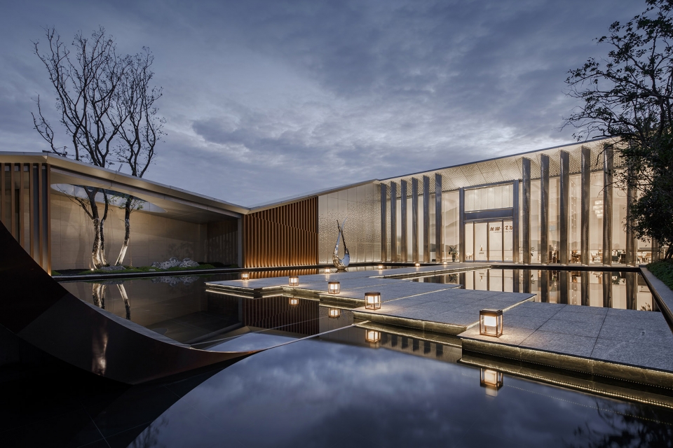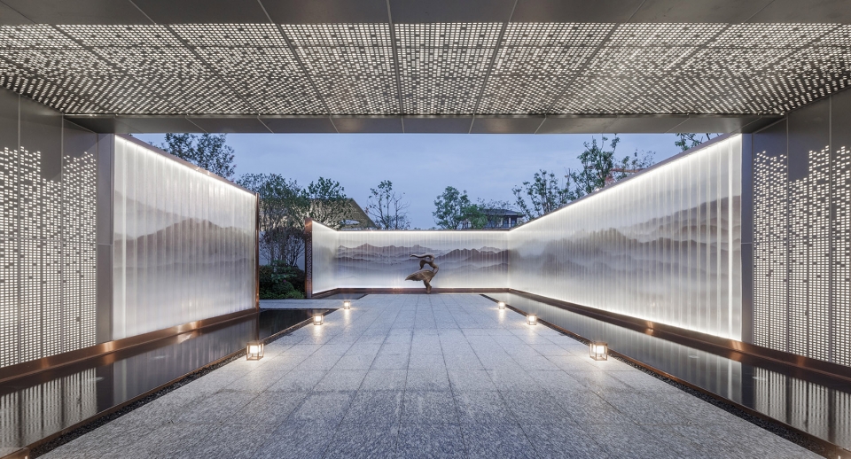 The demonstration area uses the Chinese garden for reference and adopts the design method of landscape progression and landscape variation to create rich space feeling in the limited land. The demonstration area is entered by the mountain gate, and the landscape screen wall comes into view, then turns into a small courtyard and reaches the sales office through the water trail. The center of the sales office and the model room are connected by a sunken courtyard, which is connected with each other in one go as if it were between mountains and rivers. Five into the courtyard, four turns, starting from the beginning to the end, creating a multi-scene experience.
