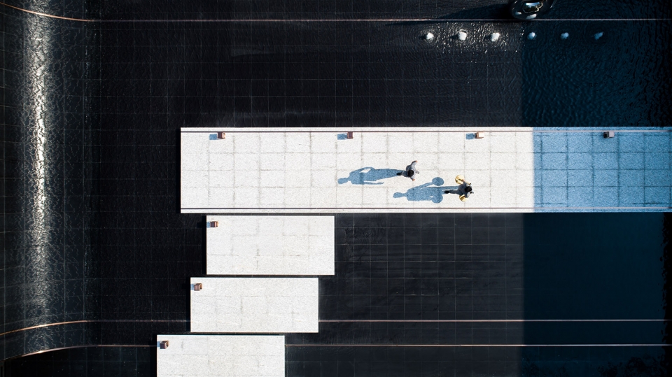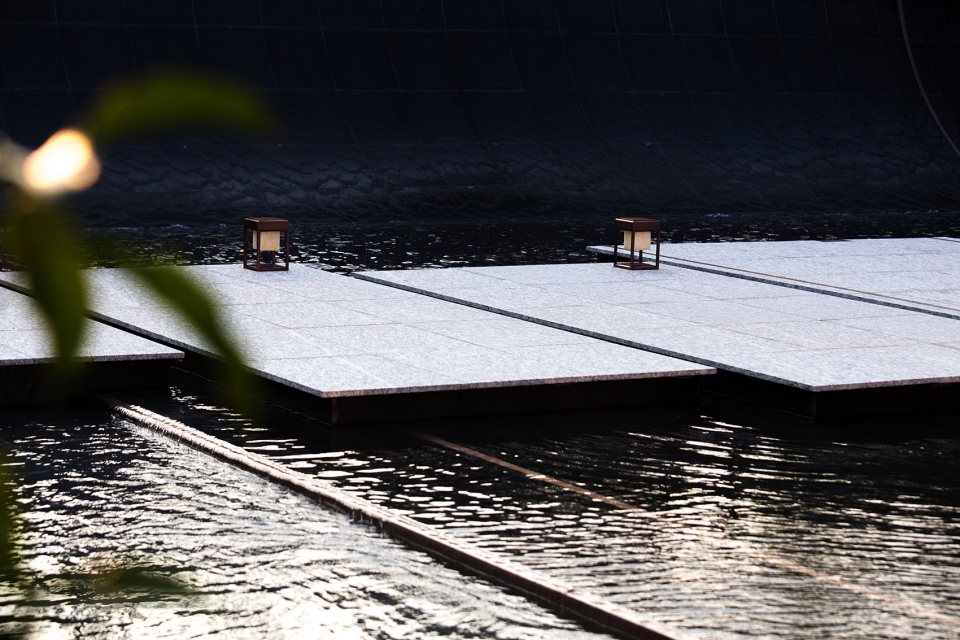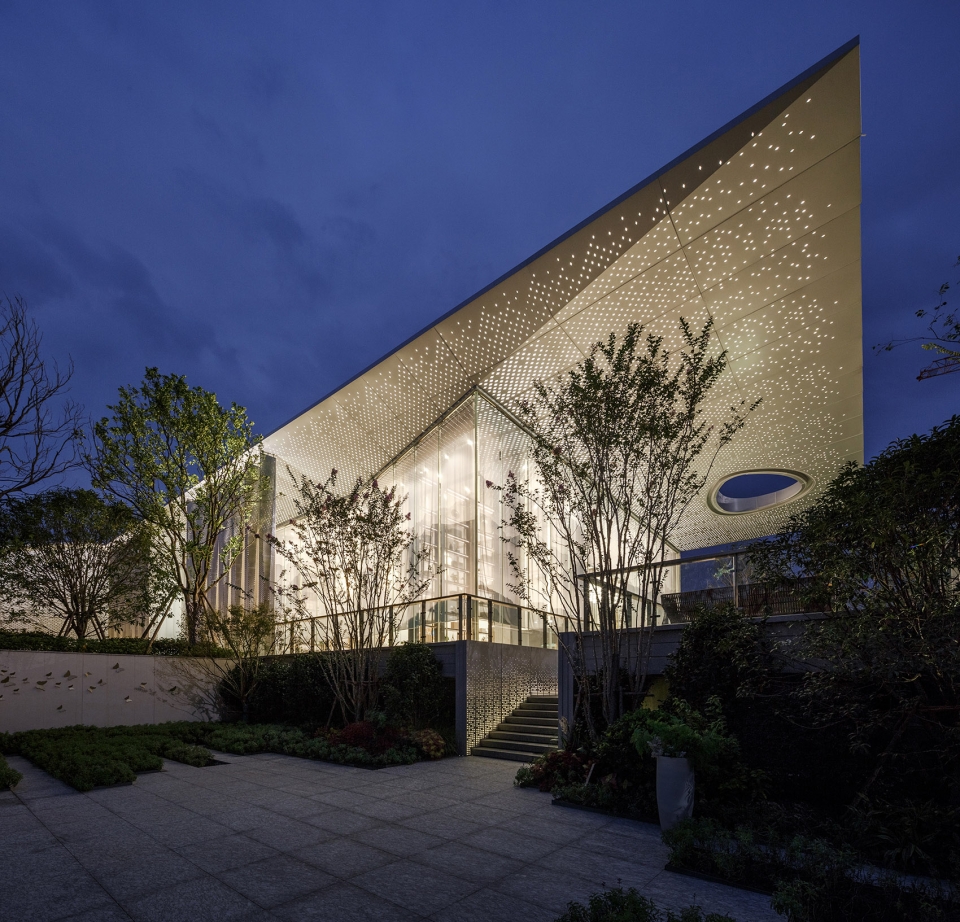 The reflection of the pure water surface shows the ups and downs of the roof form, as well as the dotted texture of the perforated plate, giving people infinite reverie