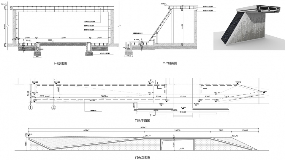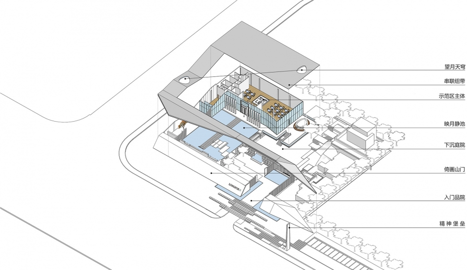 The project uses the surrounding plots to dig earth and raise the foundation so as to form a natural elevation difference in the site. Along the city interface, the landscape architecture form that closely combines the terrain with the architecture is adopted, combining with the natural site while also integrating the local culture, humanities and other elements. Shaping the slope-like view wall to isolate the bad surrounding environment. Implant functional blocks to form an inward enclosed space, and add elements such as courtyard, porch and shadow wall to enrich the internal space. So that the demonstration area can still obtain the tranquility of the inner space in the surrounding noisy environment.