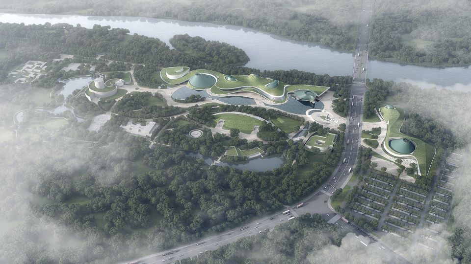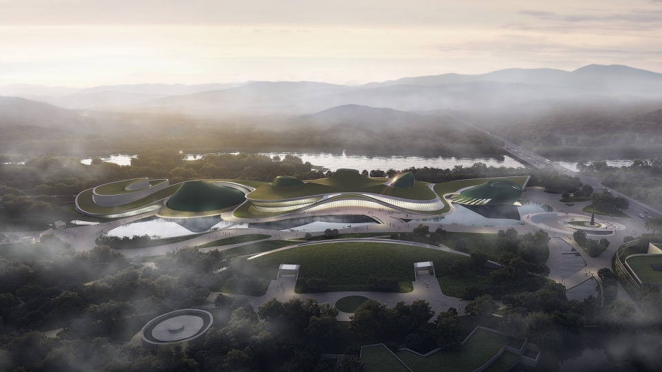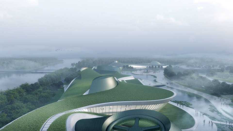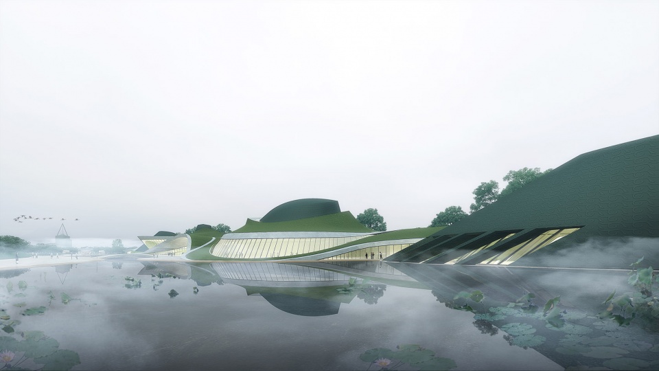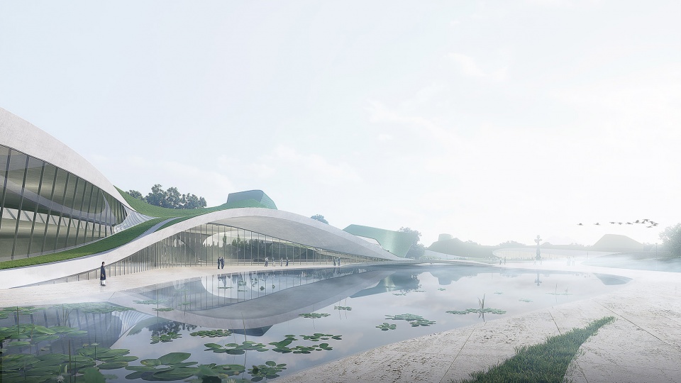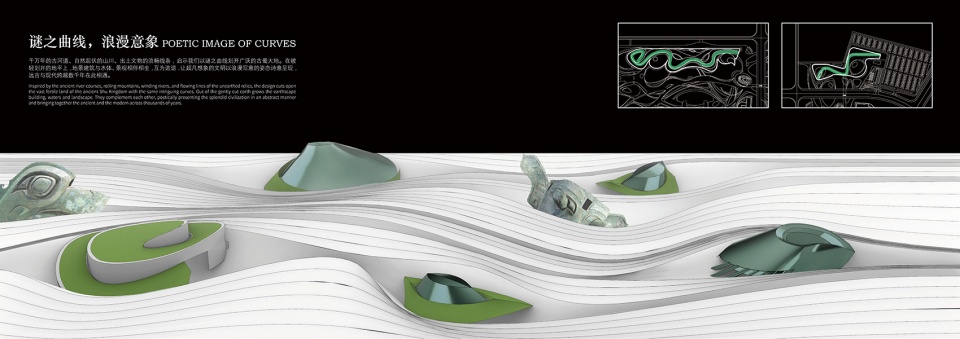 千万年的古河道、自然起伏的山川、出土文物的流畅线条,启示我们以谜之曲线划开广沃的古蜀大地。在被轻划开的地平上,地景建筑与水体、景观相伴相生,互为进退,让超凡想象的文明以浪漫写意的姿态诗意呈现,远古与现代跨越数千年在此相遇。