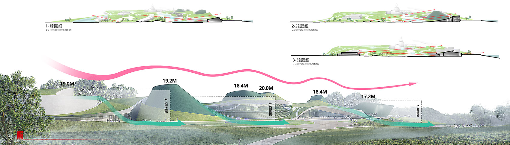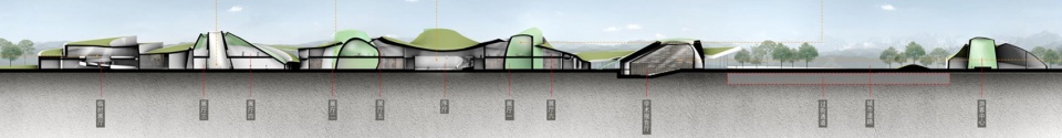 1、尺度:园区内原有建筑都是小体量建筑,最大的两个建筑体为青铜馆和综合馆,其中最突出的青铜馆,尺寸为120×80米,高40米。在400×85米的狭长用地内,我们认为不适合建设集中式的大体量建筑。因此,采用起伏的地景式和小体量的雕塑式形体组合形成建筑主体,以50米x50米的尺度控制形体变化的节奏,曲折蜿蜒的界面化解了400米长的建筑尺度,形成适宜、近人的建筑界面。
