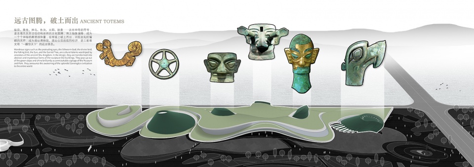 These magical symbols, such as Zongmu, silkworm, divine bird, Yufu, sun and Fusang, are the cultural totems of the holy belief and worship of the ancestors of ancient Shu. They are abstractly interpreted into mysterious sculptural volumes, breaking through the soil on the green slope, flashing brilliant light, becoming a strong symbol of the site museum and site park, and the ancient sound of "waking up and startling the world" of Sanxingdui civilization.