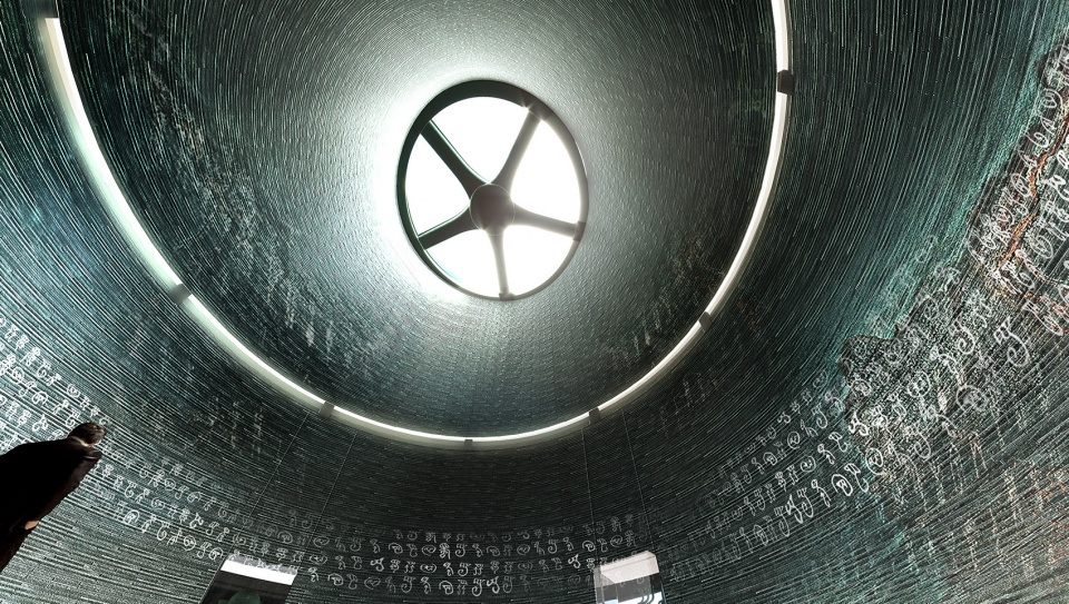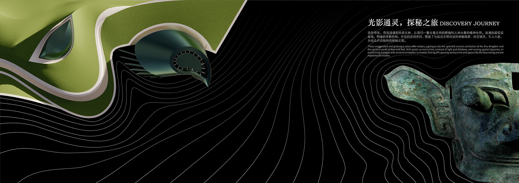 The exaggerated, strange and treacherous precious cultural relics give us a glimpse of the glory of ancient Shu civilization and the spiritual world of dancing with man and God. The romantic surreal curve, the light and shadow control of light and shade, and the spatial sequence of opening and closing create a mysterious atmosphere of dialogue with ancient civilizations. The space-time channeling and the intersection of ancient and modern provide a physical and imaginative space for people to interpret the ancient Shu culture.