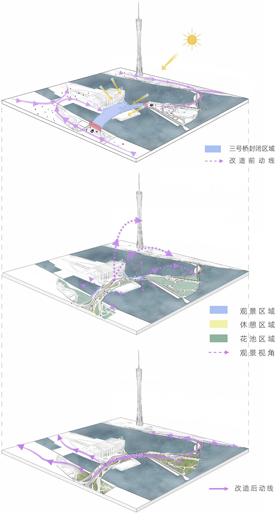 设计团队决定采用链接+疏散+观景的方案策略,把三号桥及五号桥进行联通,优化动线,用塑造景观桥的方式,与海心桥相连通将南北融为一体,成为互联互通的慢行通道,将珠江沿线核心景观一览无余。并借此实现人车分流,有效地将游客安全、有序地引导。