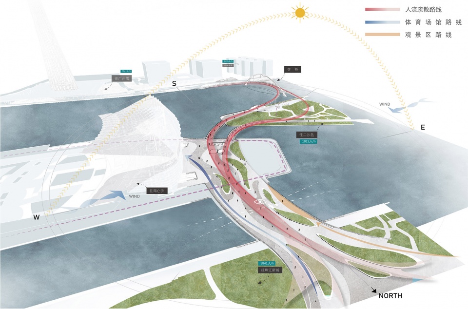 The landscape promenade connected to Haixin Bridge has become a vital node on the city’s new axis. There are several major landmarks along the way, such as the Guangzhou Opera House and Guangdong Museum, that generate heavy pedestrian flow as major attractions of the metropolis. How to continue improving these scenic sites and increasing their aesthetic appeal while at the same time being able to safely evacuate crowds in an orderly manner remains a challenge.