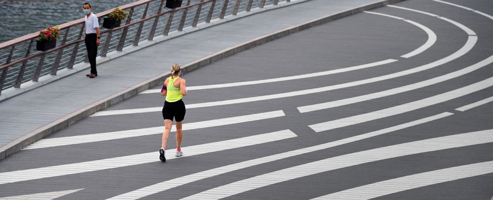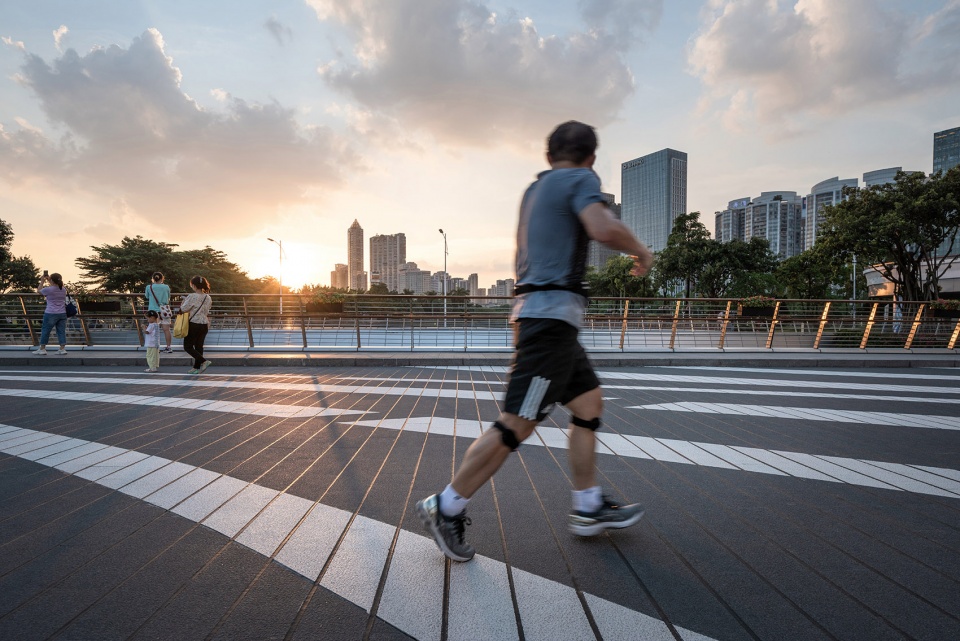 ▼五号桥上,市民进行跑步锻炼,A resident jogging on Bridge 5