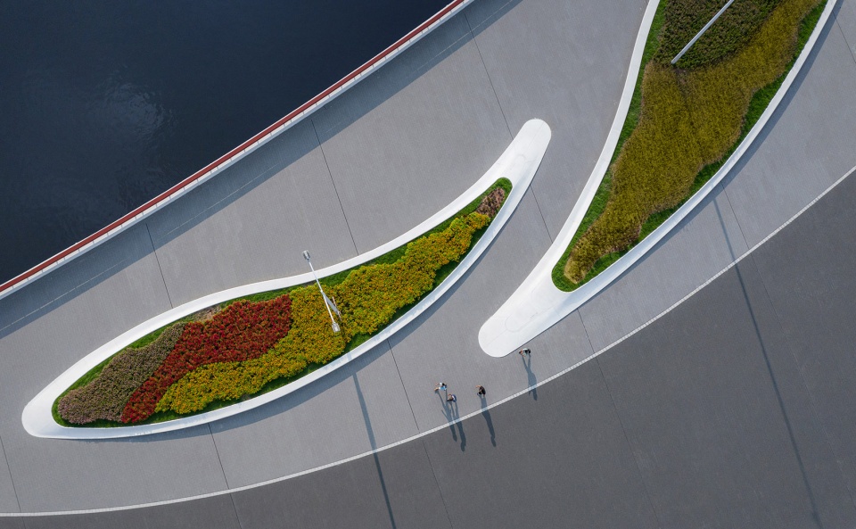 As a public area of the city, the north bank of Haixin Bridge has a strong affinity with residents. The flickering warm-toned lights on the bridge create a soft atmosphere for people at night. Another function of the contour shaped flower beds is making certain sections at a height that offers a resting spot for passing people. With the gentle river breeze and surrounded by a floral fragrance, they admire the river scenery and the liveliness nearby. The gentle slopes near the ground, on the other hand, have become a free playground for children.