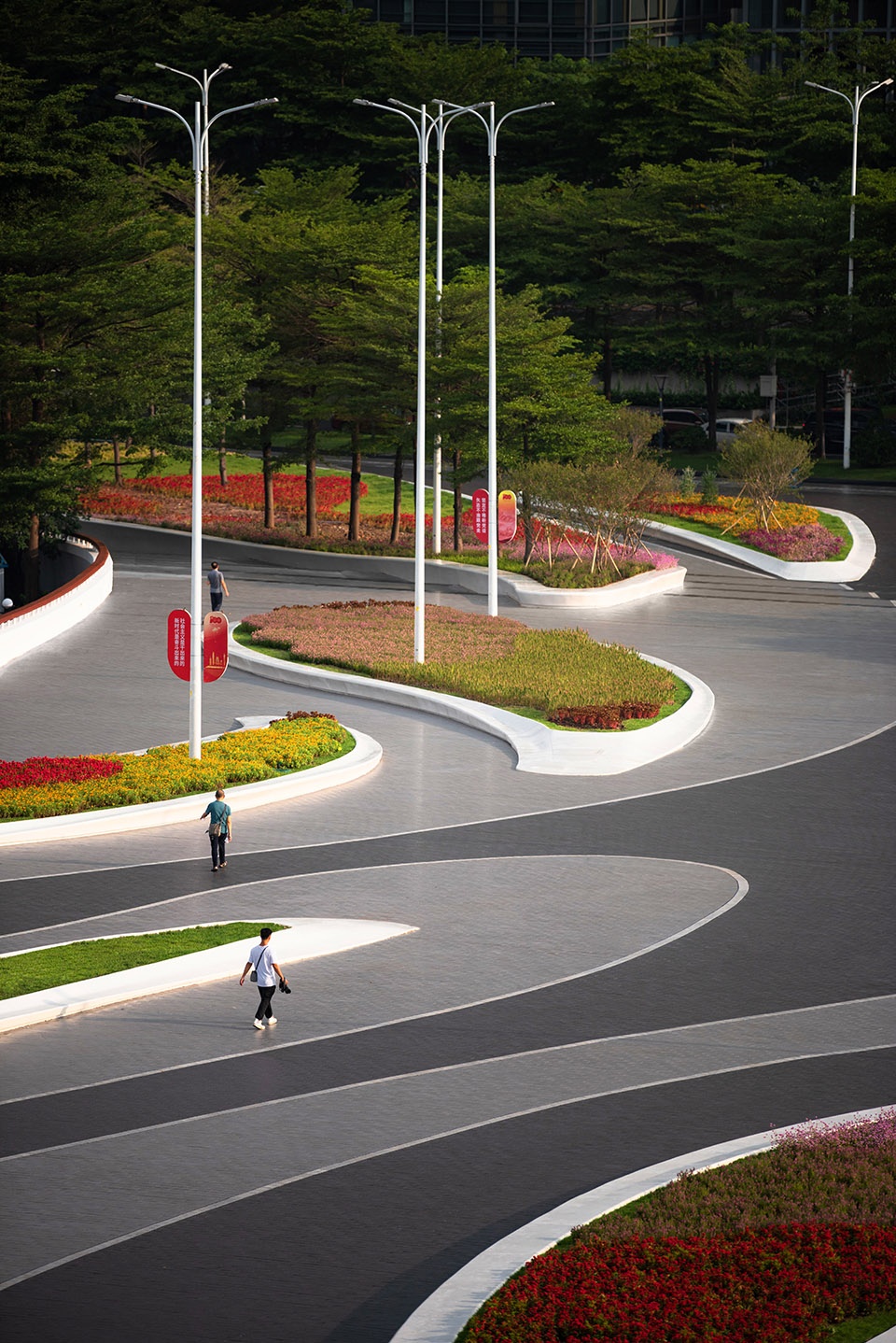 Using lines inspired by long sleeves as the basic graphic element, the combination of flower beds and walkways creates a feeling of smoothness. The gray and white walkways form concentric ripples, and white boat-shaped flower beds with beautiful flowers varying by the season are placed on the bridges like a flower boat floating on the river, giving an air of authentic Lingnan-style romance.
