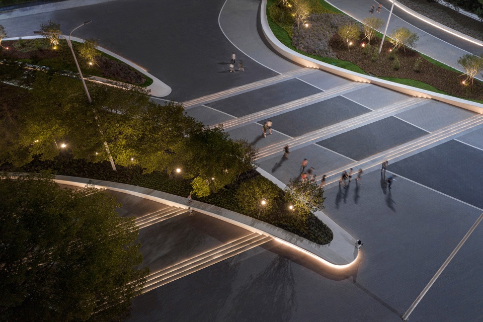 充满形式感的桥面搭配满目葱郁的植物景观,改变了原来的阴沉压抑。加装的灯光以地灯的形式出现在花池底部,减少负荷的同时也营造了温馨的城市氛围。地面铺装和花池以黑白灰为主色调,白色花池,内部空心,尽端伏低贴近地面,减少桥的负重,花池中植物多为鲜艳品种。