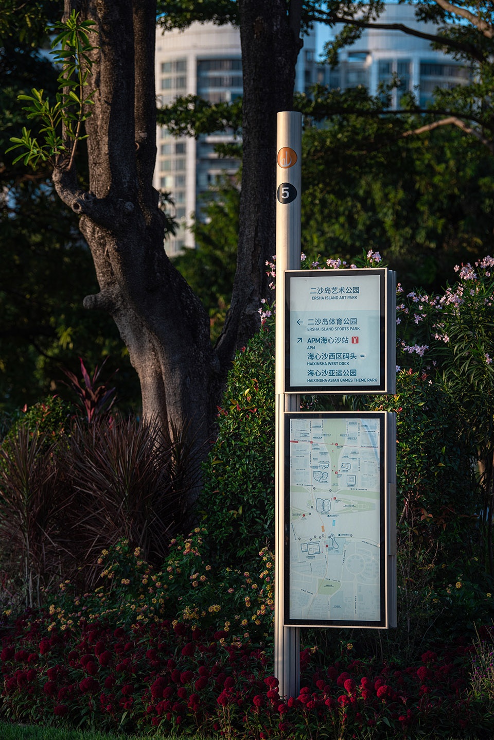 According to the different landscape field requirements in the Haixin Bridge North Bank Landscape Upgrade Project, the way-finding system, as an information transmission system that combines the relationship between the environment and users, has derived different forms under the premise of maintaining the unity of appearance and the convenience of information transmission. Guiding city furniture of multi-size and scale.