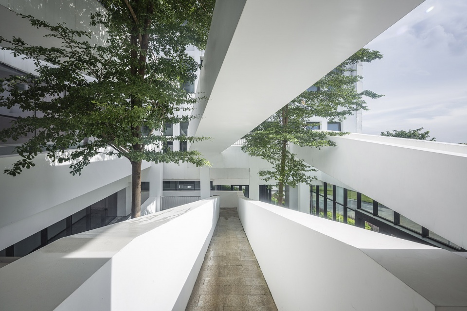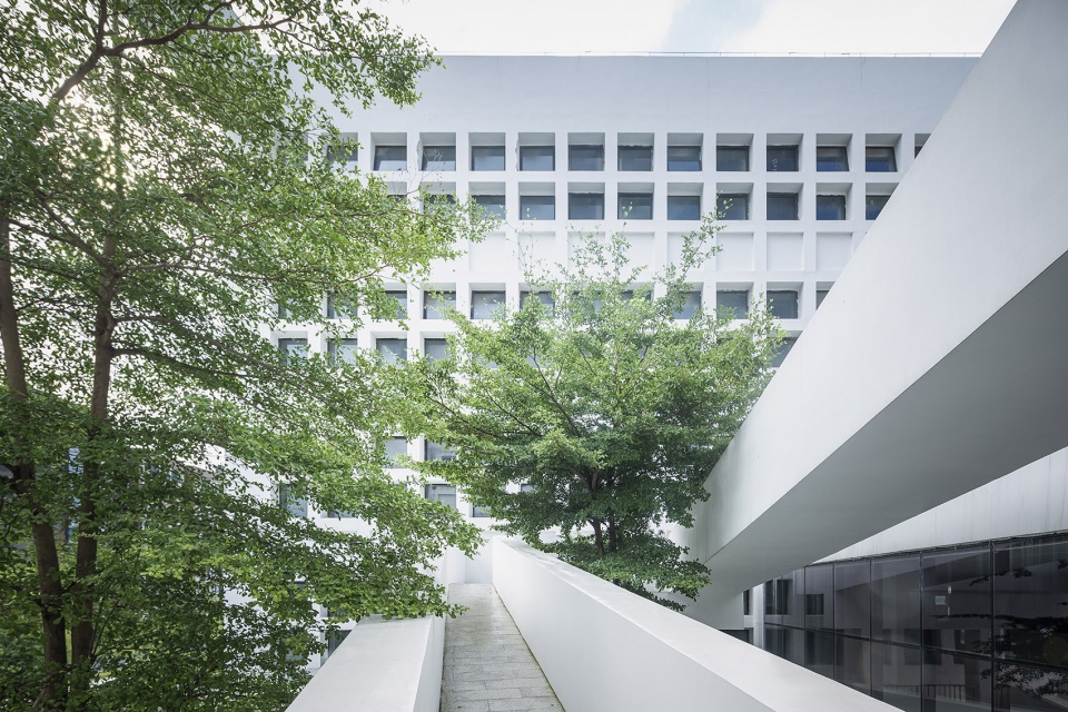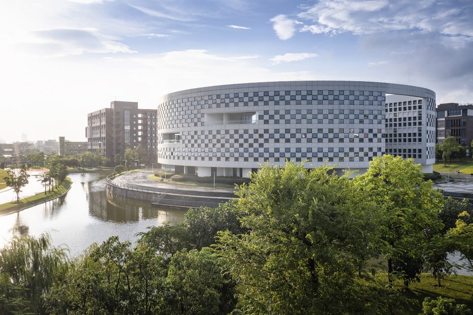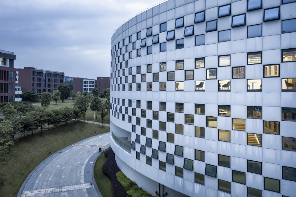 Due to the adjustment of construction investment, the design needs to complete the curtain wall design of the facade with a relatively limited cost under the condition that the structural frame has been completed. Finally, the design team selected the modularization façade with the grid format of the unitary square fiber cement exterior wall boards and square windows. The facade form realizes effective shading, comfortable lighting and unique framed scenery in a more economical way. The pure and concise architectural form is integrated with the surrounding green slopes, becoming the focus of the campus landscape.