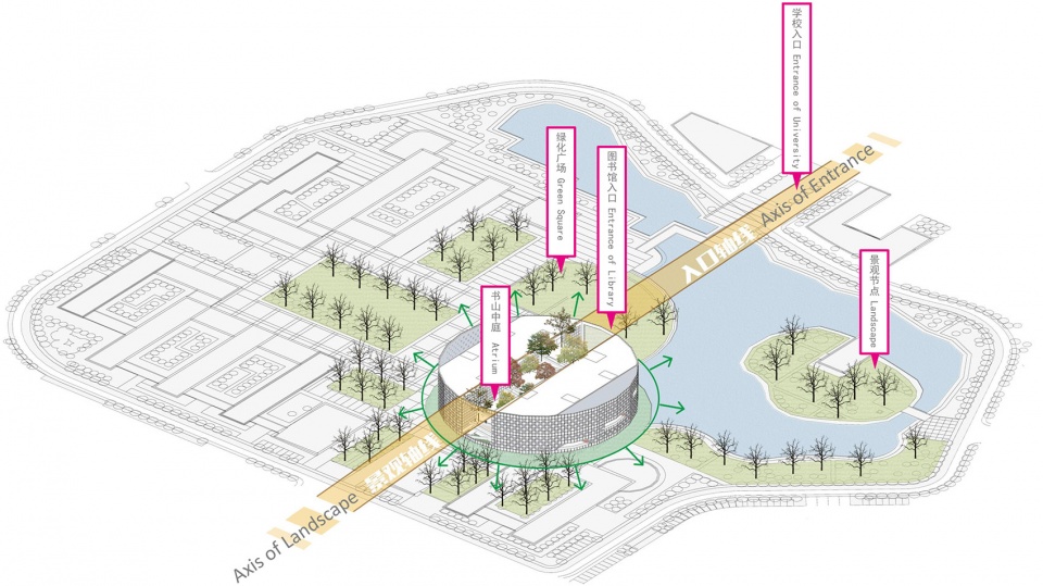 图书馆在总体规划中位于校园的正中心,正对东侧的主入口轴线,南侧是开阔的湖景而北侧面对开敞的绿地。建筑采用圆形平面的体量,以弧形界面最大化的利用周边优美的校园环境,实现景观视野的均好性和整体形式的独特性。圆形体量沿校园正门轴线剖开以强调中心的仪式性,同时将公共活动引入图书馆内部,通过不同层次的平台、坡道形成内外贯通而流动的立体轴线。