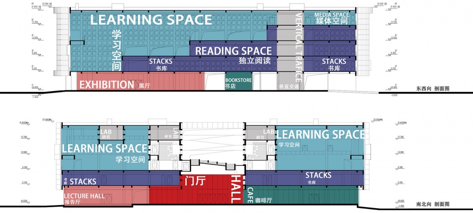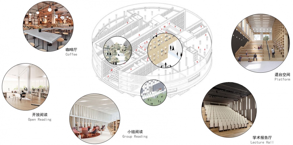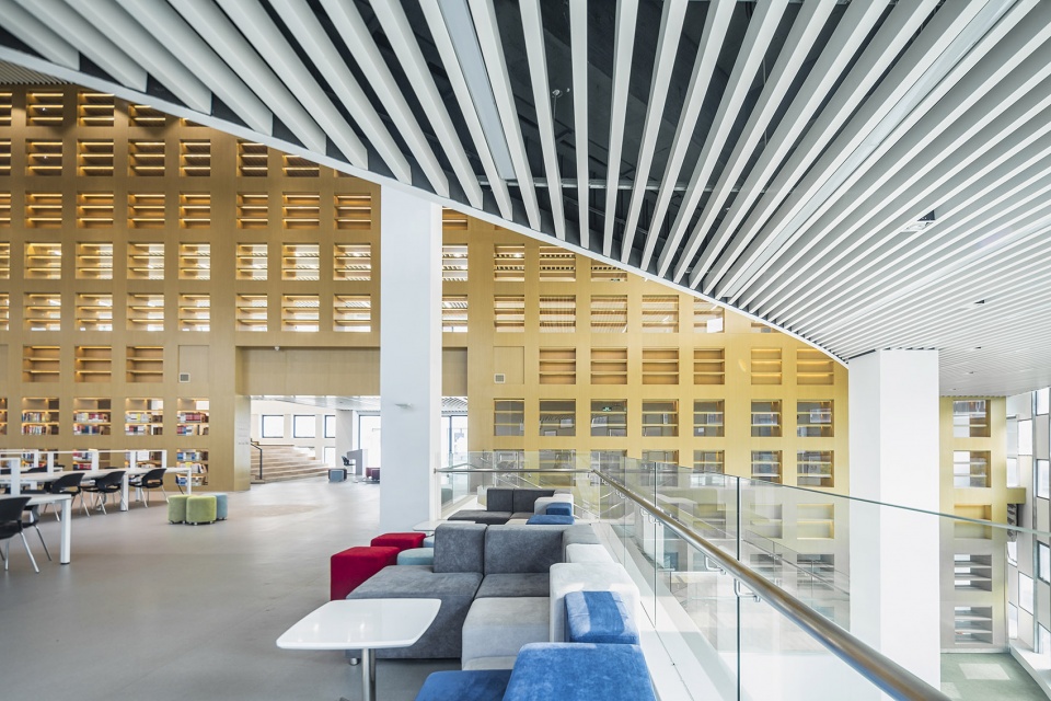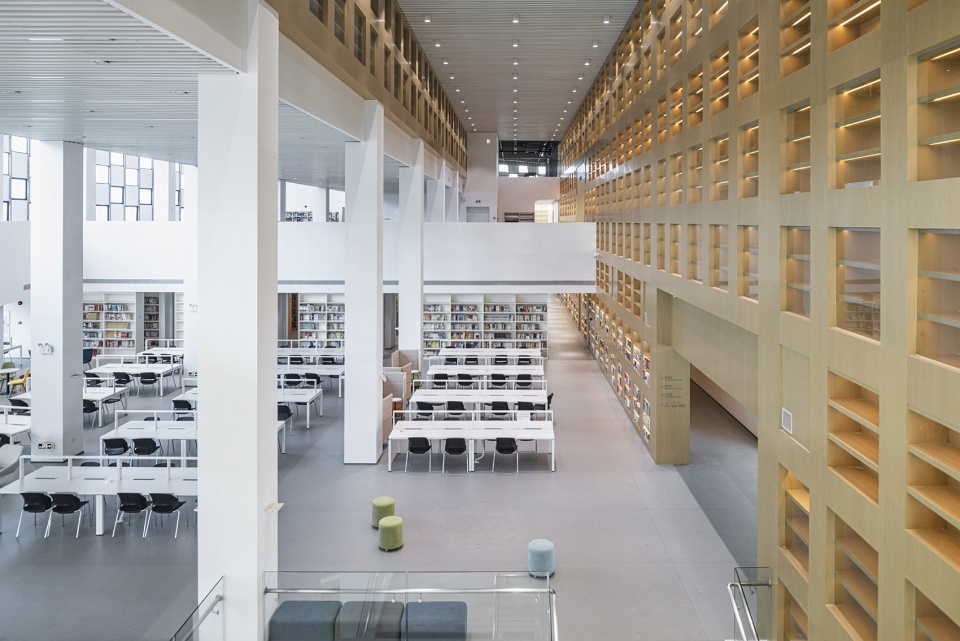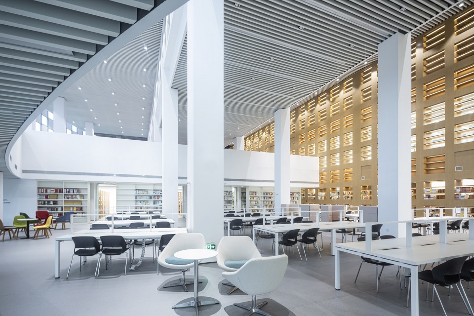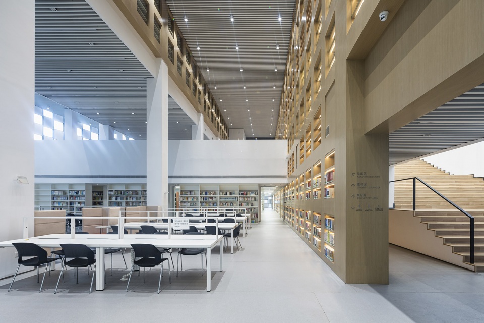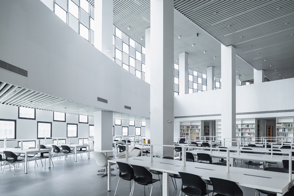 The contemporary university library is a student-oriented comprehensive learning center, including the diversified functions of reading, communication, research, display and leisure for the new generation of college students and teachers. In the design, the first floor of the building is equipped with public spaces such as lecture halls, bookstores, cafes and exhibition halls that can be serviced to the outside world. The top floor is mainly for internal use functions such as administrative offices and independent research areas; the 2-3 floors adopt a general and three-dimensional layout mode the reflects openness and mobility. It is flexible combination of different learning activities, such as open-shelf reading, group discussion and personal research.