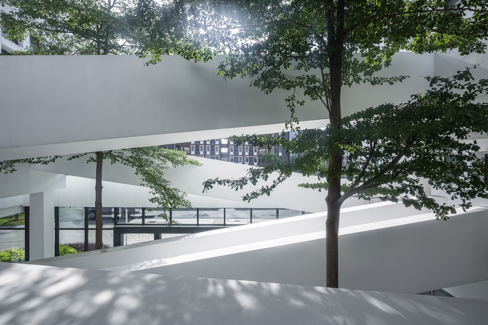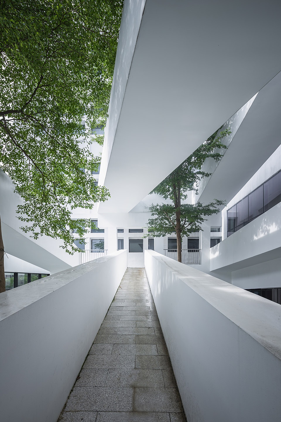 The center of the circle along the campus axis shapes a cascading outdoor public activity space that connects the inside and the outside, a metaphor for the library theme of “the mountains of books have roads of diligence”. From the campus, you can directly pass through the “Book Mountain” interspersed with ramps, stairs, platforms and green trees, which not only connects the learning spaces on the north and south, but also extends the indoor and outdoor spaces through greening. The experience in the three-dimensional garden space is like a natural climbing.