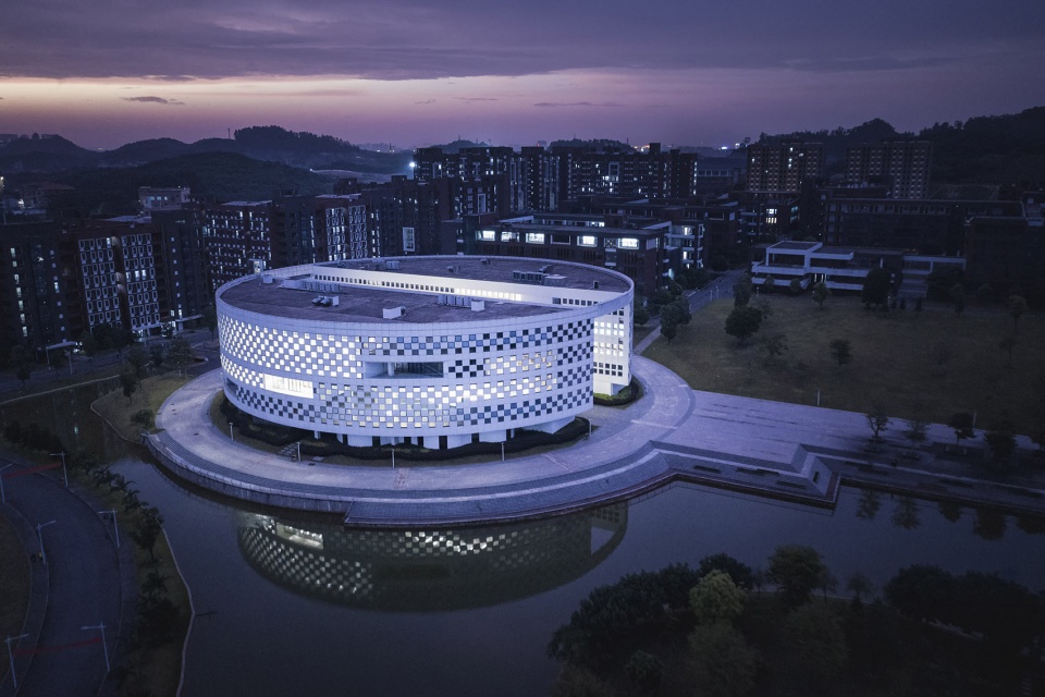 This project is located on the campus of Guangdong Vocational College of Hotel Management, Houjie Town, Dongguan City, with a building area of nearly 20,000 square meters and a height of 22 meters with five-story. The planning of campus according to the natural topography, in a beautiful environment with undulating green areas and surrounding water bodies. The site is located directly on the core of the east-west main axis of the campus facing the main entrance to be an important landmark building in the campus planning. In the south, it is an open lake and landscape, and in the north is the central green space among the main teaching buildings. The building is a compound campus learning center, contains comprehensive functions such as library reading, exhibitions and meetings, research and discussions, student activities, leisure and entertainment, and office assistance. The architecture and interior design fully consider the overall public space structure of the campus planning, emphasize the function positioning of the campus learning center, coordinate the construction cost and operation requirements of the college, to create a campus node with a simple appearance but rich spatial levels, open and innovative functions, to highlight the campus cultural characteristics of the hotel management college.