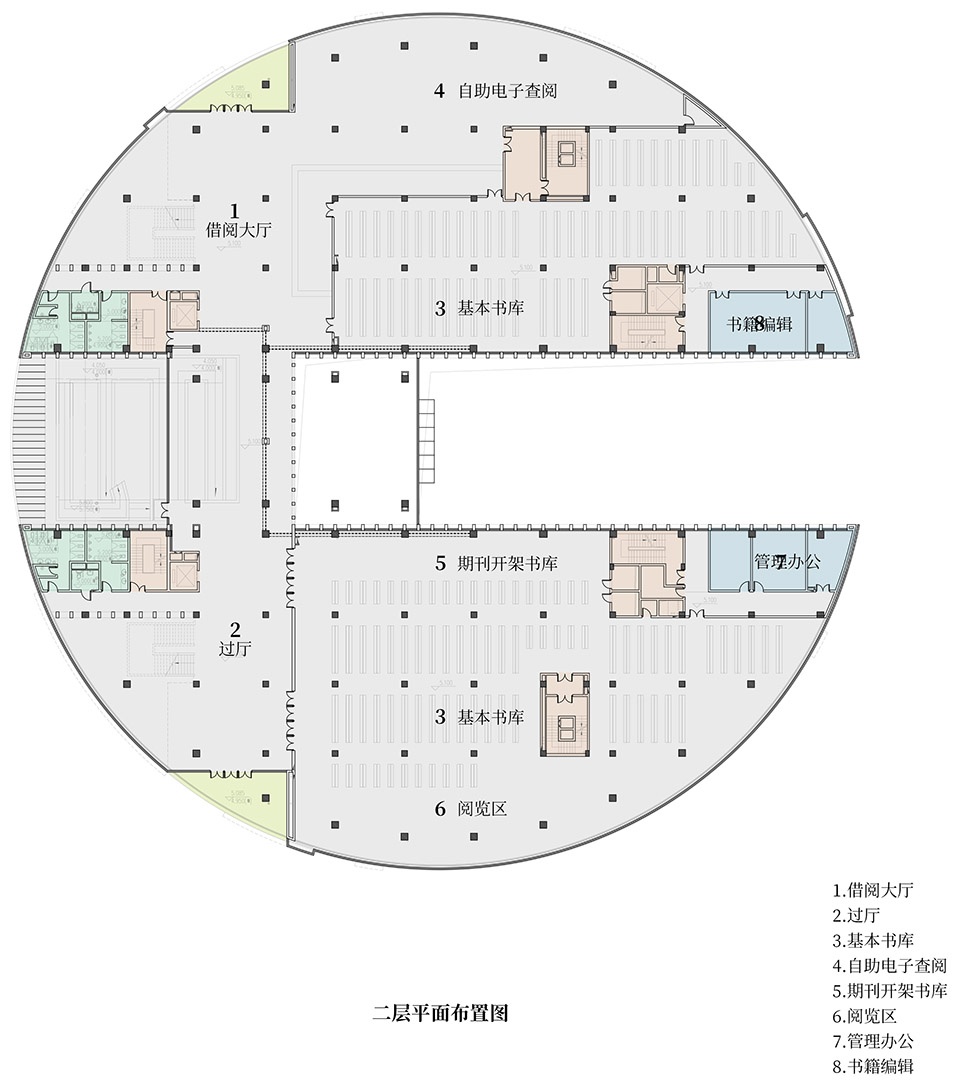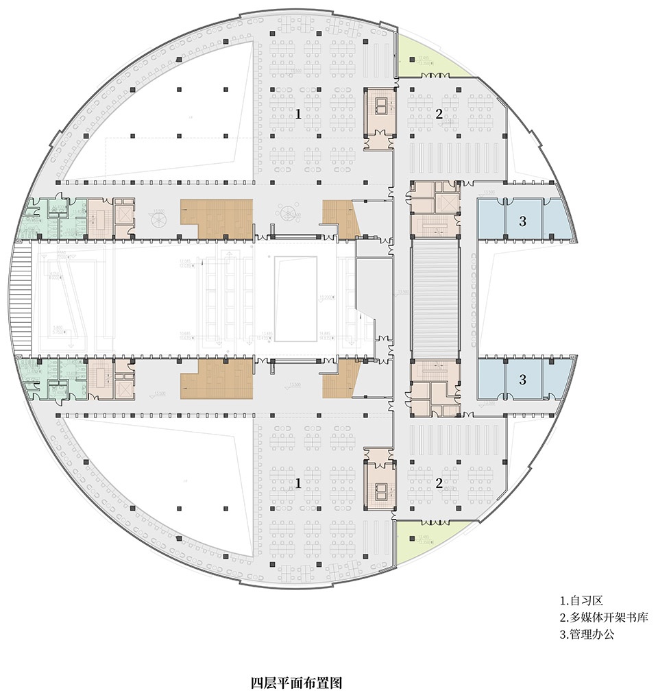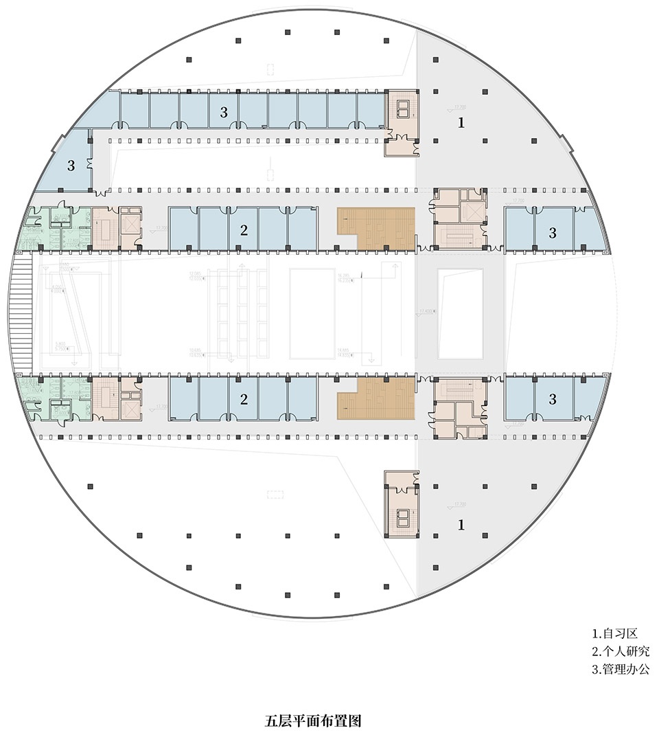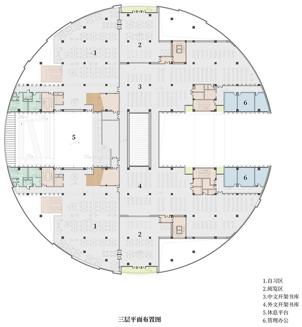 当代的高校图书馆是以学生为本的综合学习中心,包括新一代大学生以及教师团队的阅读、交流、研究、展示和休闲等多元化功能。建筑首层设置报告厅、书店、咖啡厅及展厅等可对外服务的公共空间,顶层以行政办公、独立研究区等内部使用功能为主;2-3层空间采用通用而立体的布局模式,不同类型的开架阅读、小组讨论和个人研究空间灵活组合,体现开放性与流动性。