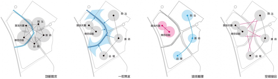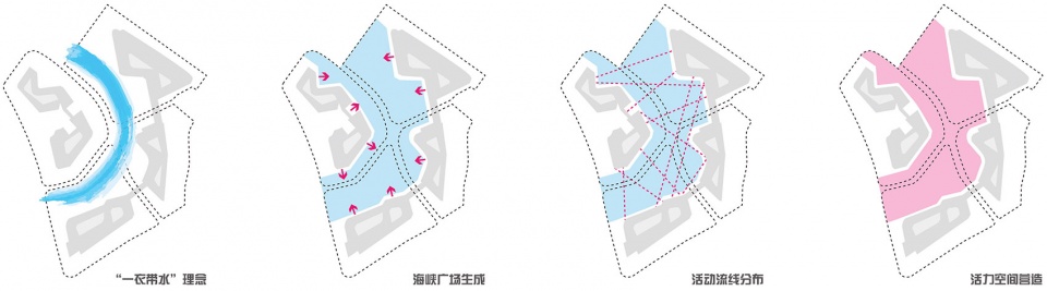 产生的带状空间打造成峡湾广场,有效加强了区内各种以海峡旅游为主题的城市功能的联系,积聚人气与活力,促发了各个功能区块之间更为紧密的联系,使得各个子项最大程度地形成资源共享。
