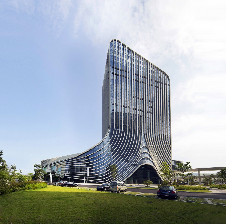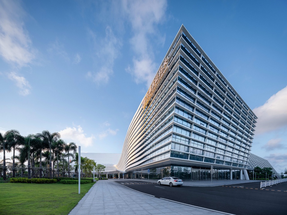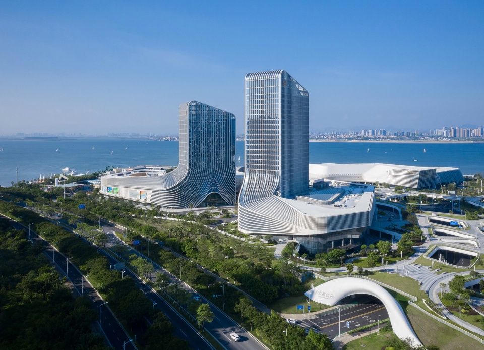 The design cleverly borrows the profound cultural significance behind the construction land to solve the problems caused by the defects of the land itself.”Closely separated but closely connected” shows the relationship between xiamen and Taiwan, and also interprets the design connotation of this architectural group.”Appropriate separation” in response to site constraints.”Closely connected” to unify the overall image of the building.The architecture and landscape design of the site are completed in one go. The three-dimensional rotating volume seems to be formed by the waves on the shore freezing in the air.The landscape design of this scheme strongly strengthens the concept of planning and design, and forms a foil to the architectural style.The design of the fjord plaza emphasizes the linear design approach, with simple and smooth lines, highlighting the concept of tourism, movement and speed, and enhancing the overall dynamic feeling.In the processing of night scene, the fine light from layer upon layer of louvers is just like the rows of fine waves. Without extra lighting, the building itself implicitly expresses its flashing value.