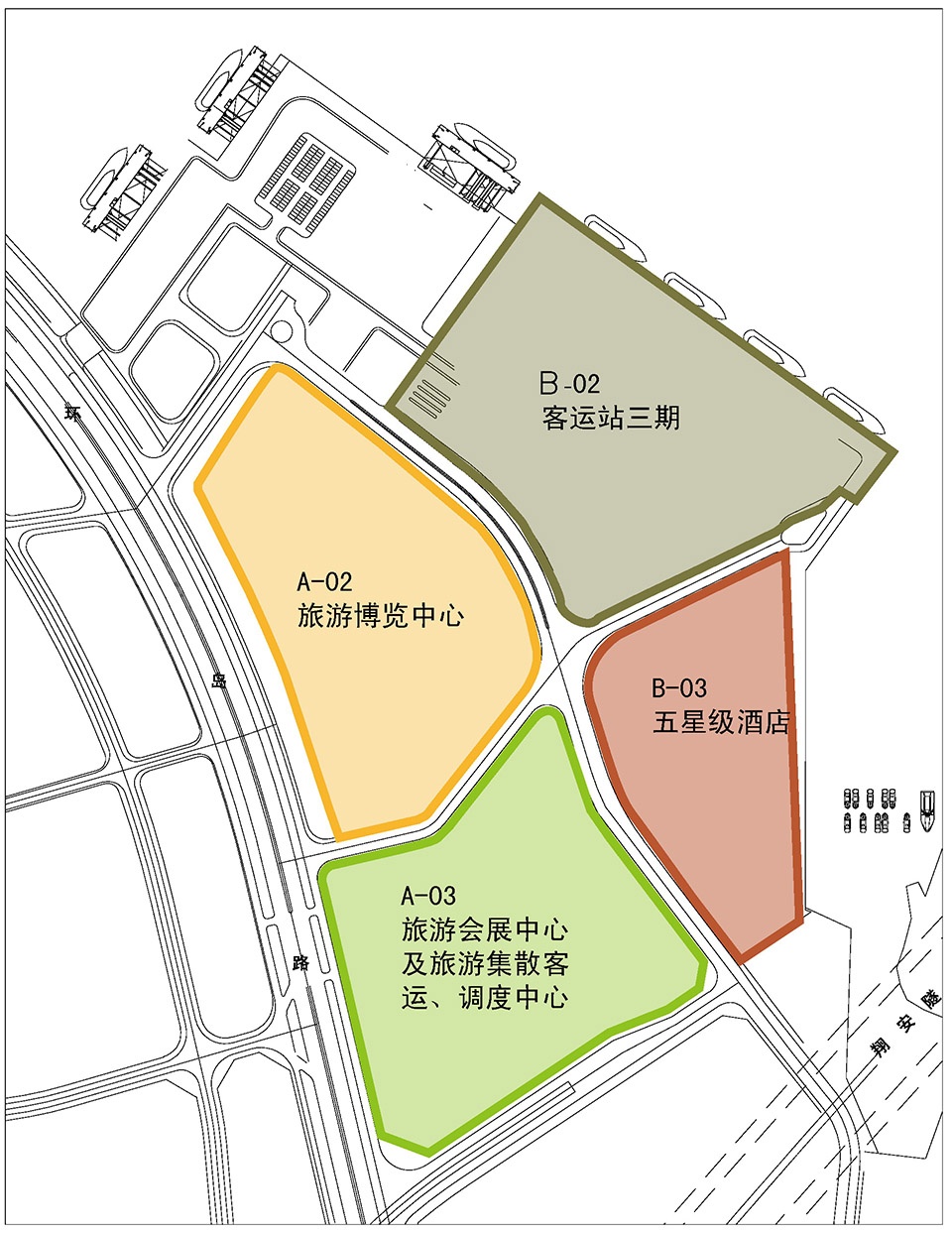 A-03用地为旅游会展中心及旅游集散客运、调度中心。会展中心为国家旅游博览会的永久会址,中小型专业性会展项目举办场地,提供功能齐全的中小型展览馆。方案调整后设置了下沉广场,半地下室设置有旅游集散中心、客运站、调度中心及其配套用房。建筑北面留出约30000平方米广场,平时作为共用停车及集散场地,赛时作为国际马拉松赛起跑广场。会展造型以两个相互交织的曲线形体,在态势上形成富有张力的雕塑效果。