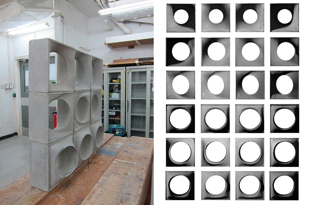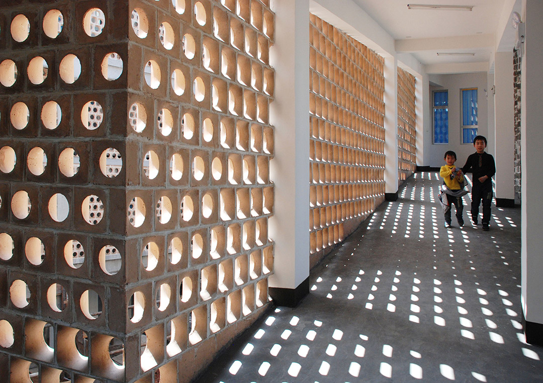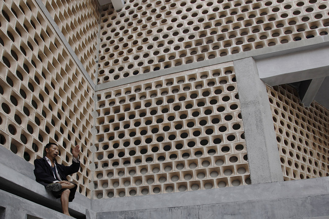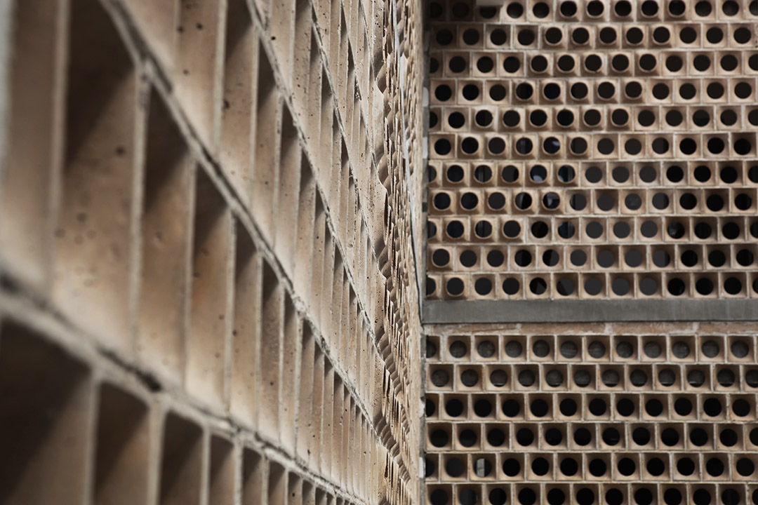 混凝土砌块砖与再生砖远看并无二样,但当人们靠近时会发现与通常造型不一样的砌块圆洞造型(圆洞借由乳胶模具产生),独一无二的造型让建筑在阳光下产生出柔软多变的光影效果。